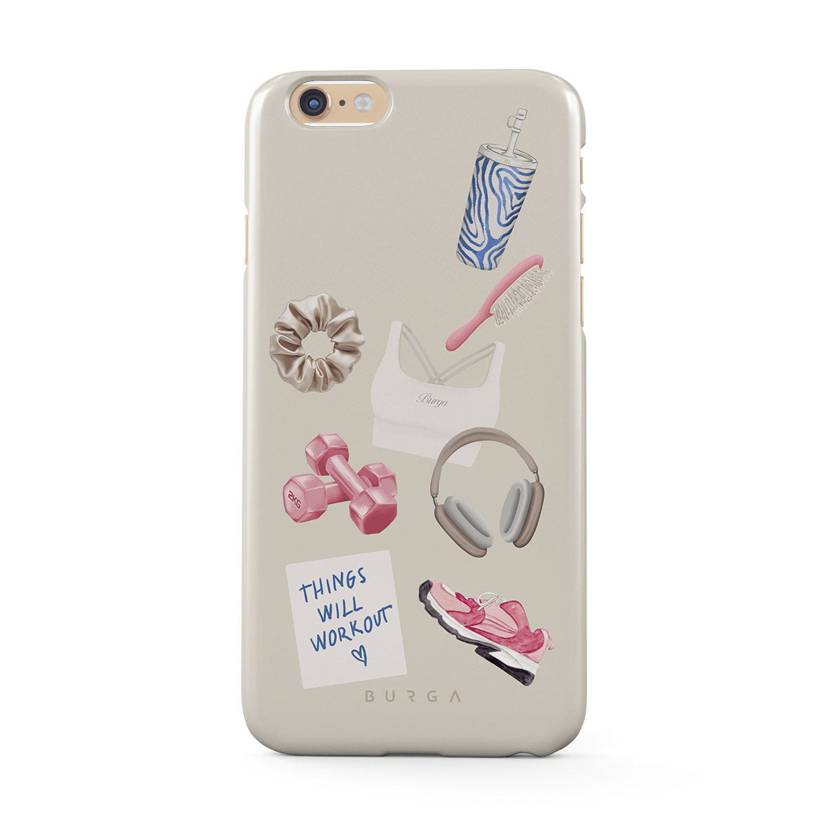 This design features: dumbbells, headphones, tumbler, hairbrush, pink trainers, sports bra, crunchie, "Things Will Work Out" sticky note