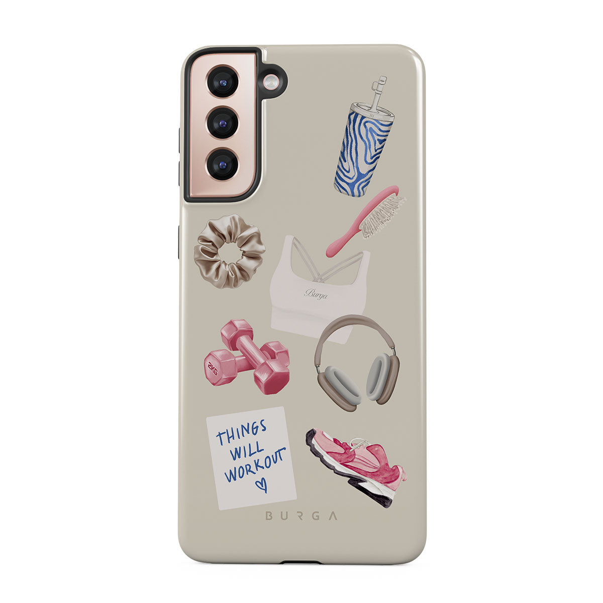 This design features: dumbbells, headphones, tumbler, hairbrush, pink trainers, sports bra, crunchie, "Things Will Work Out" sticky note