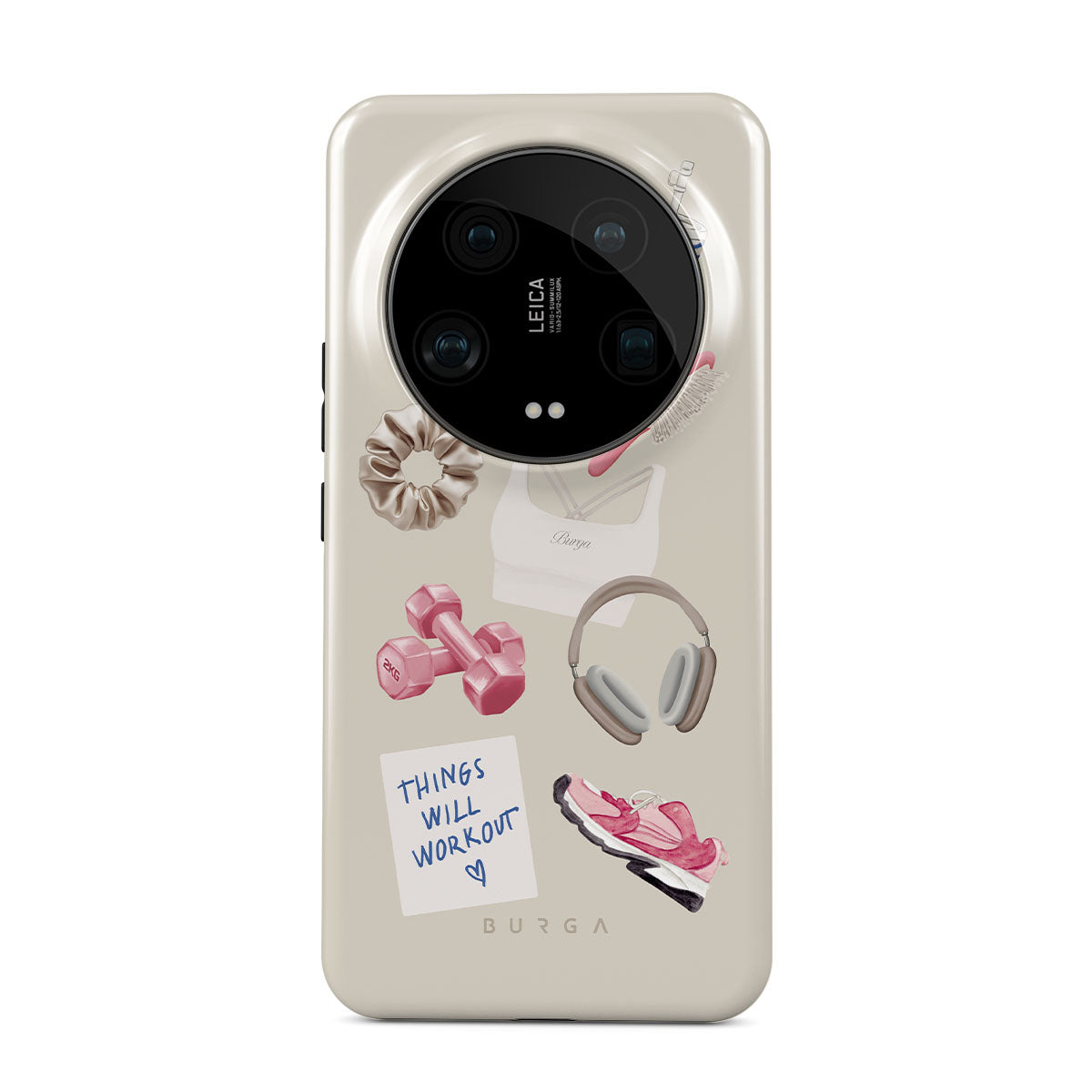 This design features: dumbbells, headphones, tumbler, hairbrush, pink trainers, sports bra, crunchie, "Things Will Work Out" sticky note