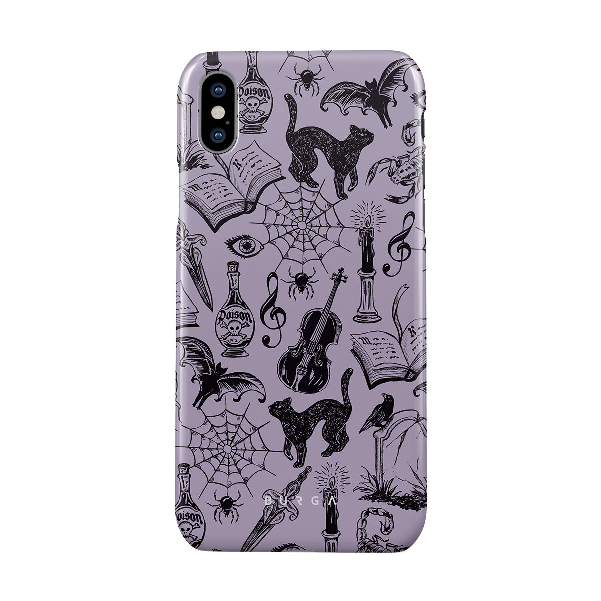 This design features: gothic doodles, mystical elements, spiders, spiderweb, cat, violin, eye, candle, dagger, book, bat, crow, scorpion