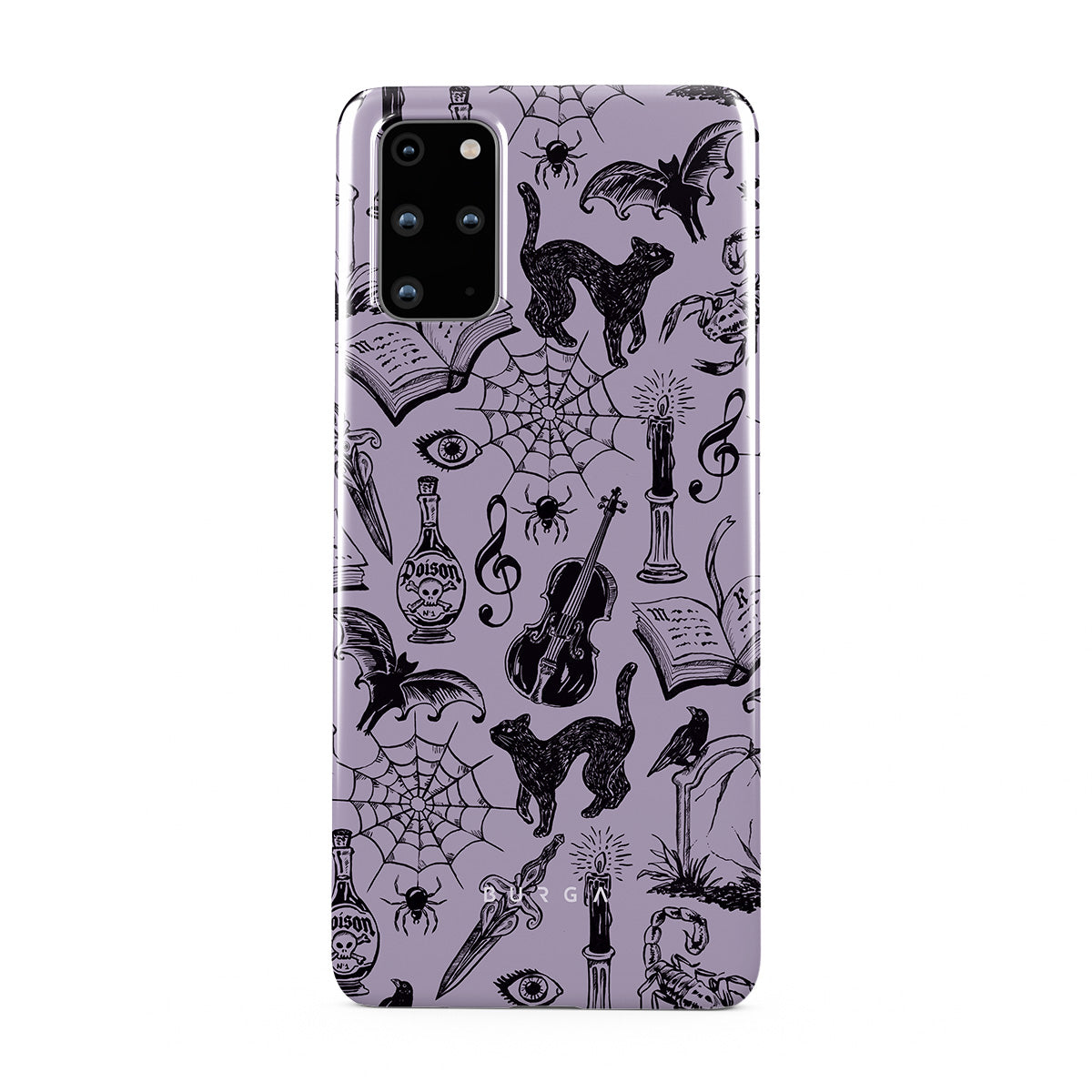 This design features: gothic doodles, mystical elements, spiders, spiderweb, cat, violin, eye, candle, dagger, book, bat, crow, scorpion