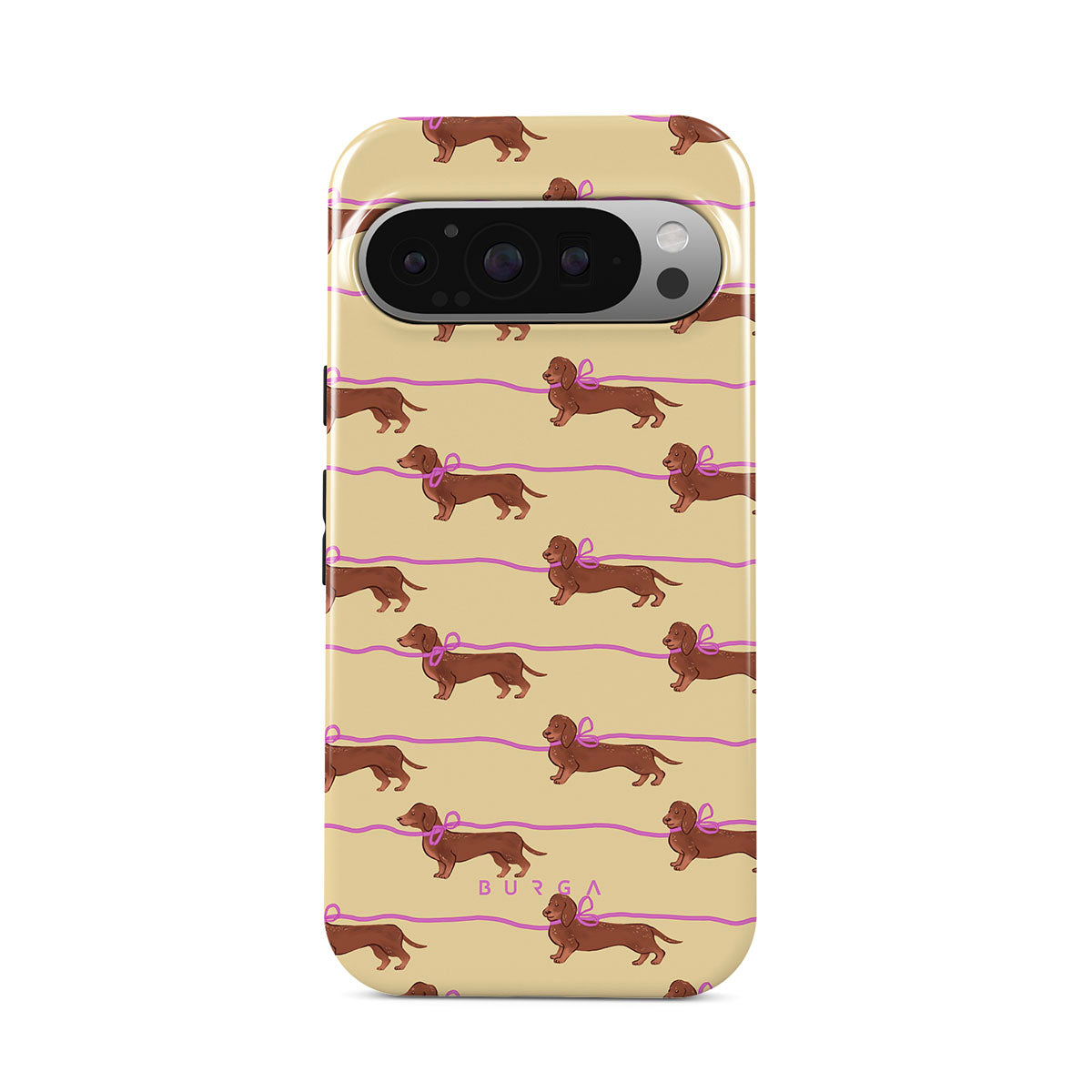 This Google Pixel 9 Pro XL phone case design doesn’t believe in time, only vibes. It features sassy sausage dogs with bows who, like you, are running 15 minutes behind—and blaming Mercury.
