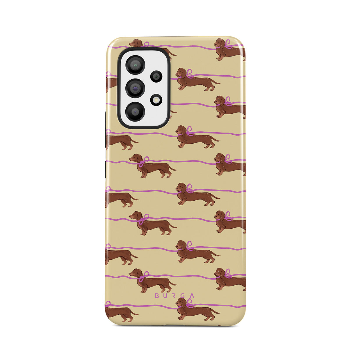 This Samsung Galaxy A33 phone case design doesn’t believe in time, only vibes. It features sassy sausage dogs with bows who, like you, are running 15 minutes behind—and blaming Mercury.