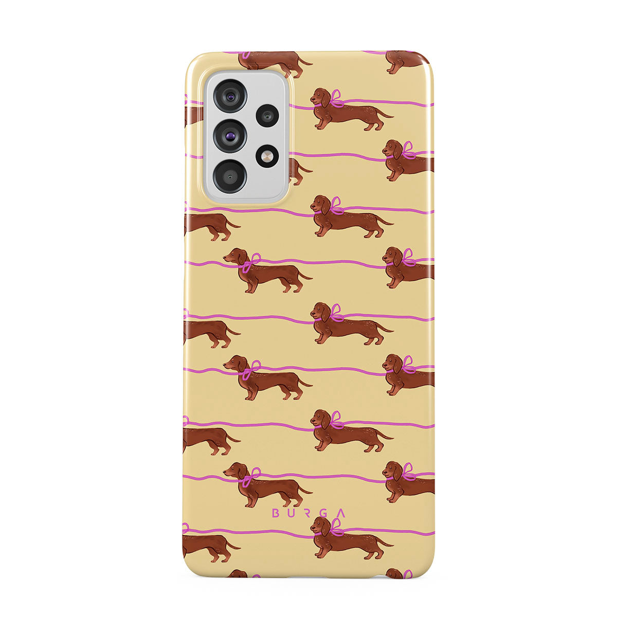 This Samsung Galaxy A72 4G / 5G phone case design doesn’t believe in time, only vibes. It features sassy sausage dogs with bows who, like you, are running 15 minutes behind—and blaming Mercury.