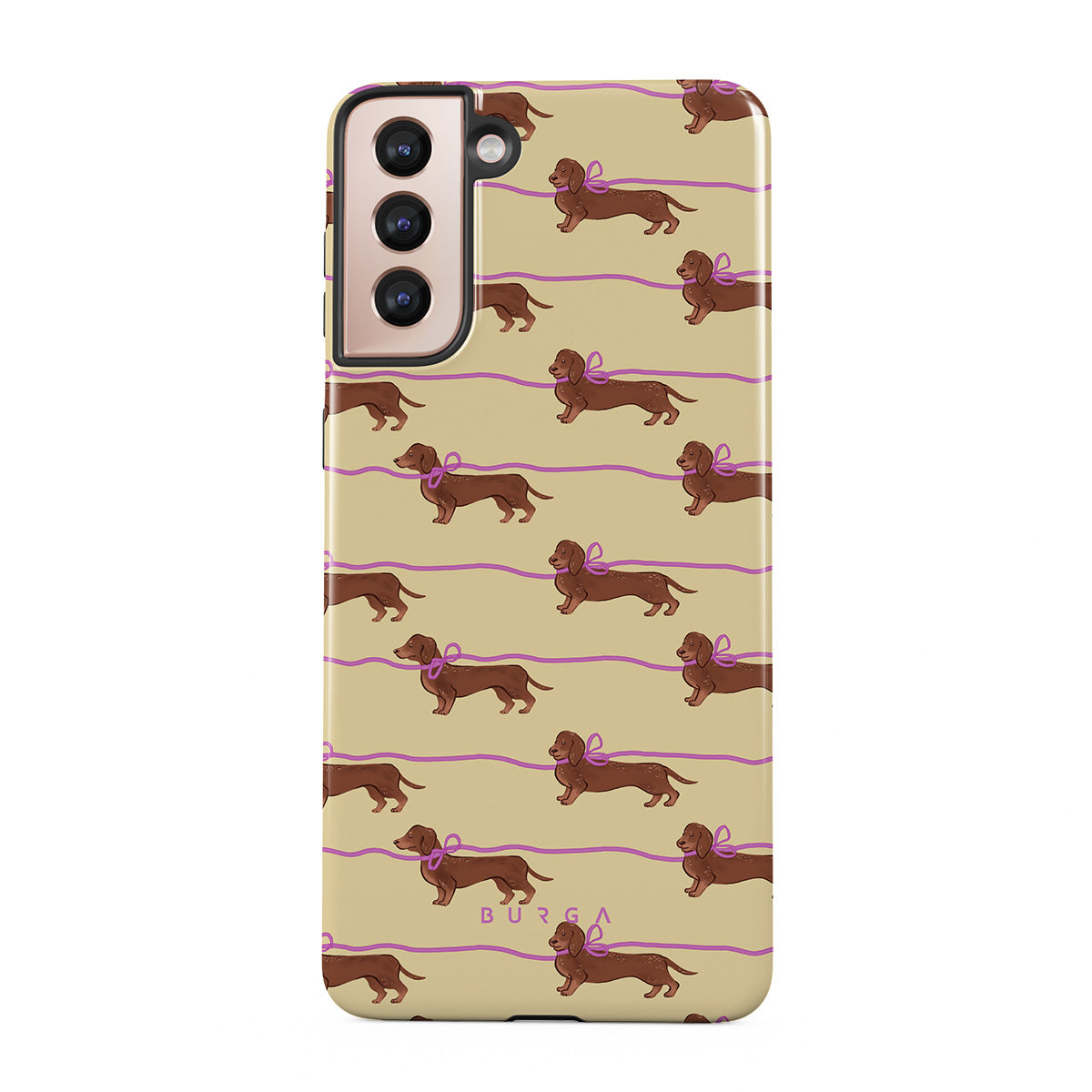 This Samsung Galaxy S21 Plus phone case design doesn’t believe in time, only vibes. It features sassy sausage dogs with bows who, like you, are running 15 minutes behind—and blaming Mercury.
