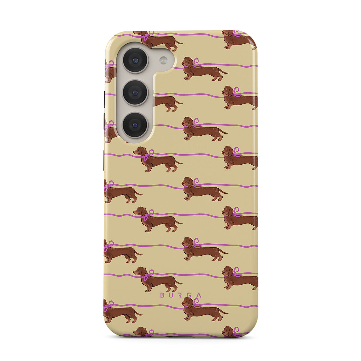 This Samsung Galaxy S23 phone case design doesn’t believe in time, only vibes. It features sassy sausage dogs with bows who, like you, are running 15 minutes behind—and blaming Mercury.