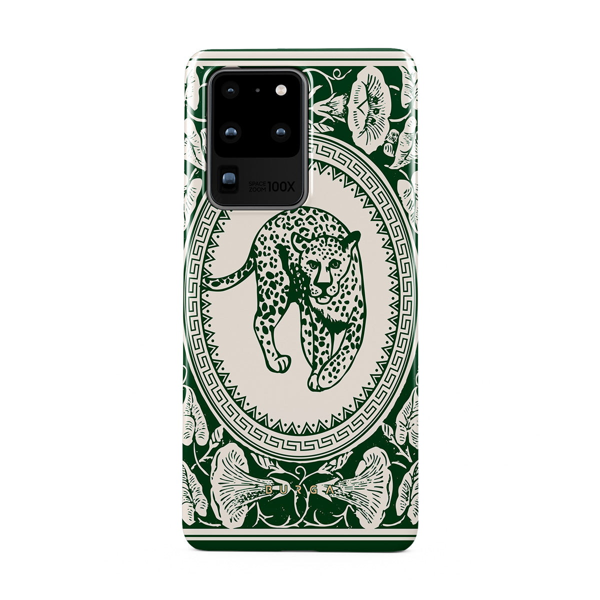 Our Antique Samsung Galaxy S20 Ultra 4G / 5G phone case designa nude canvas kissed by refined green contours, painting an eternal saga of elegance. Enthroned at its center is a regal leopard embraced by a tender floral caress. A nod to timeless opulence, this design captures the essence of vintage prestige.