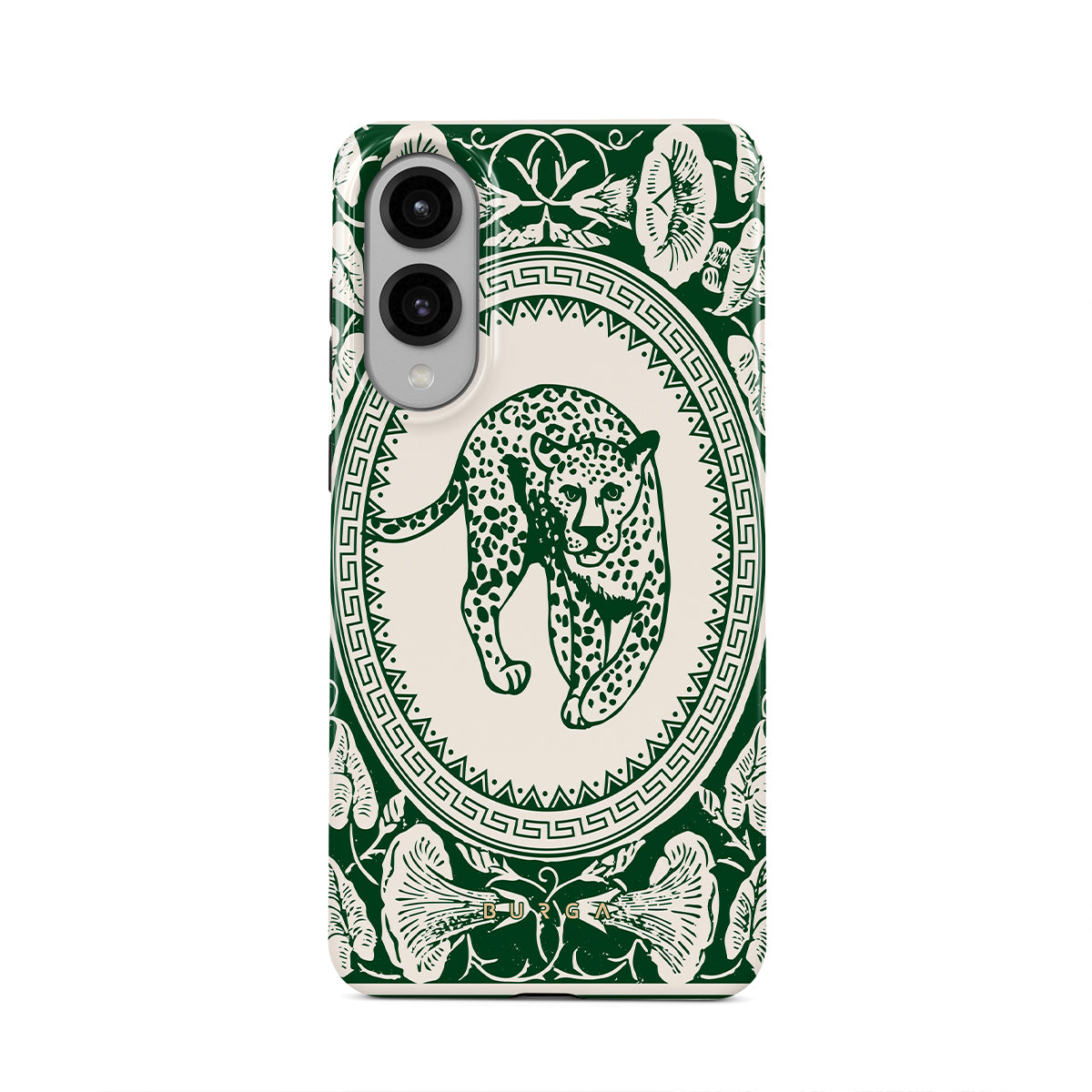 Our Antique Samsung Galaxy S25 Edge phone case design—a nude canvas kissed by refined green contours, painting an eternal saga of elegance. Enthroned at its center is a regal leopard embraced by a tender floral caress. A nod to timeless opulence, this design captures the essence of vintage prestige.