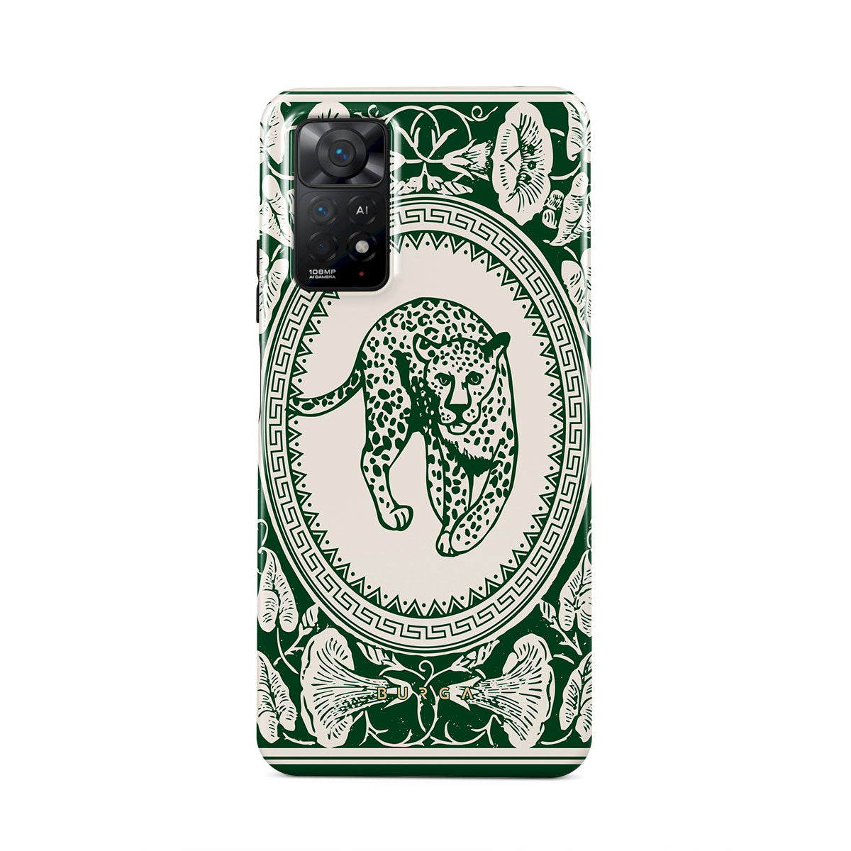 Our Antique Xiaomi Redmi Note 11 Pro+ phone case design—a nude canvas kissed by refined green contours, painting an eternal saga of elegance. Enthroned at its center is a regal leopard embraced by a tender floral caress. A nod to timeless opulence, this design captures the essence of vintage prestige.