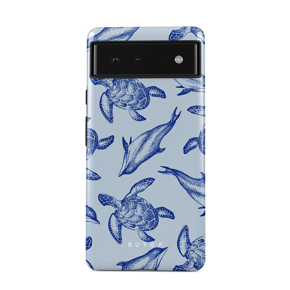 A beautiful design featuring lively turtles and dolphins playfully dancing in serene light blue water. Dive into the ocean's rhythm with our Aquatic Dance Google Pixel 6 case.
