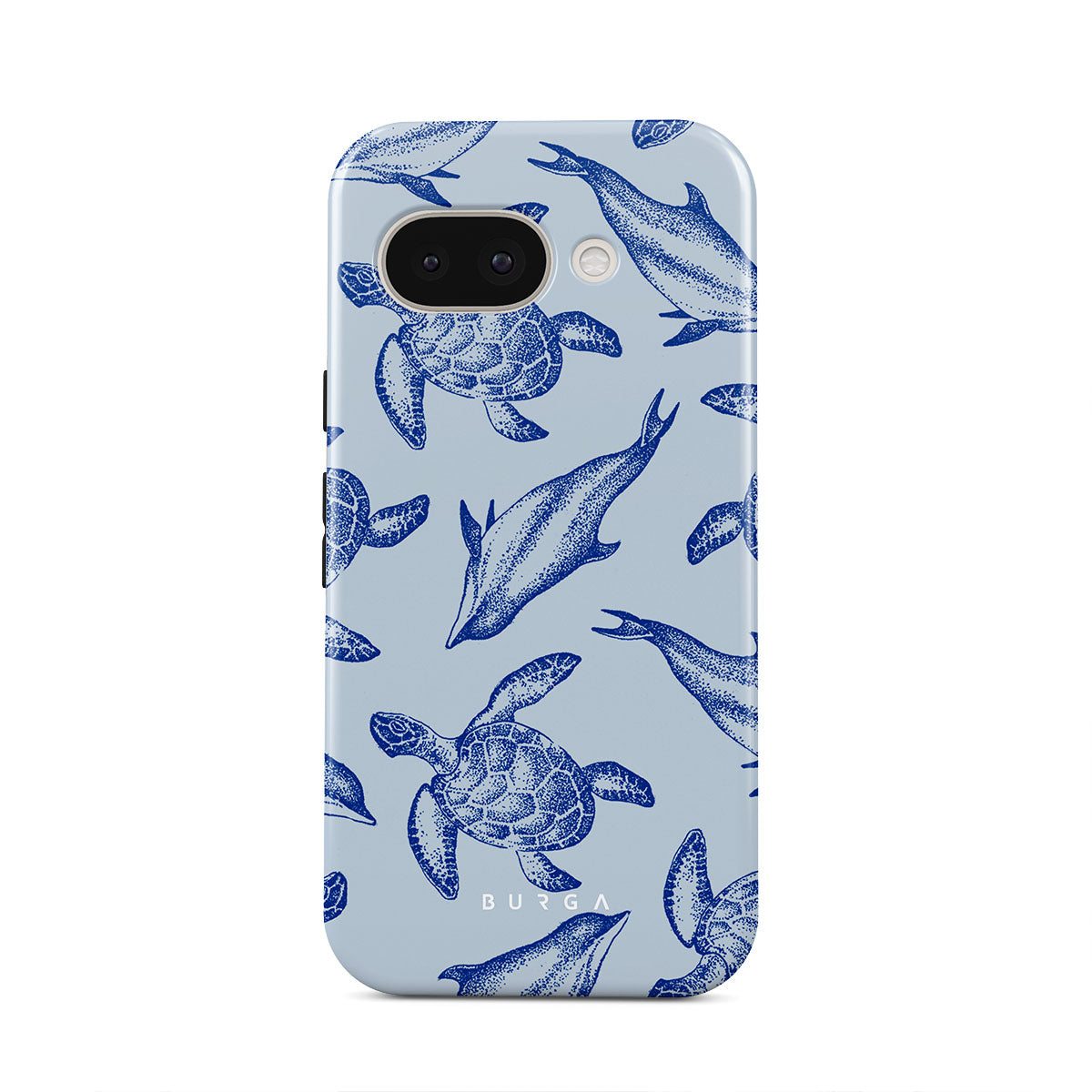 A beautiful design featuring lively turtles and dolphins playfully dancing in serene light blue water. Dive into the ocean's rhythm with our Aquatic Dance Google Pixel 9a case.