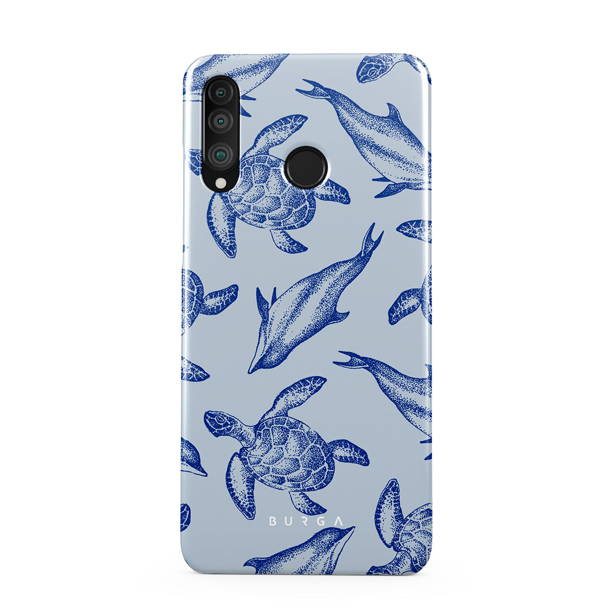 A beautiful design featuring lively turtles and dolphins playfully dancing in serene light blue water. Dive into the ocean's rhythm with our Aquatic Dance Huawei P30 Lite case.