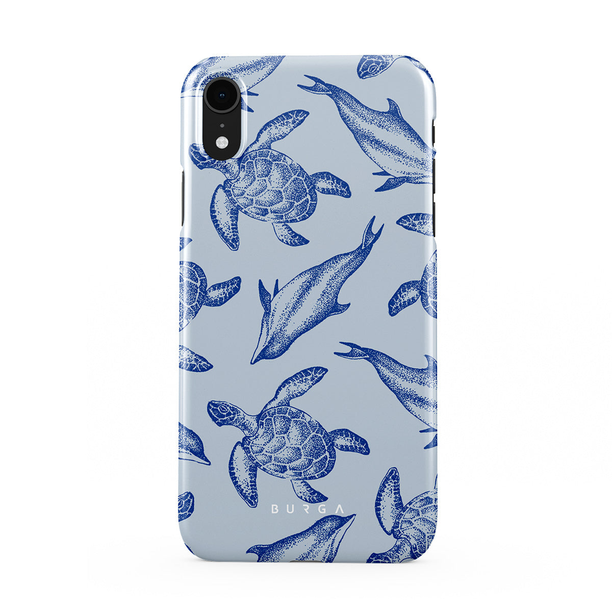A beautiful design featuring lively turtles and dolphins playfully dancing in serene light blue water. Dive into the ocean's rhythm with our Aquatic Dance iPhone XR case.