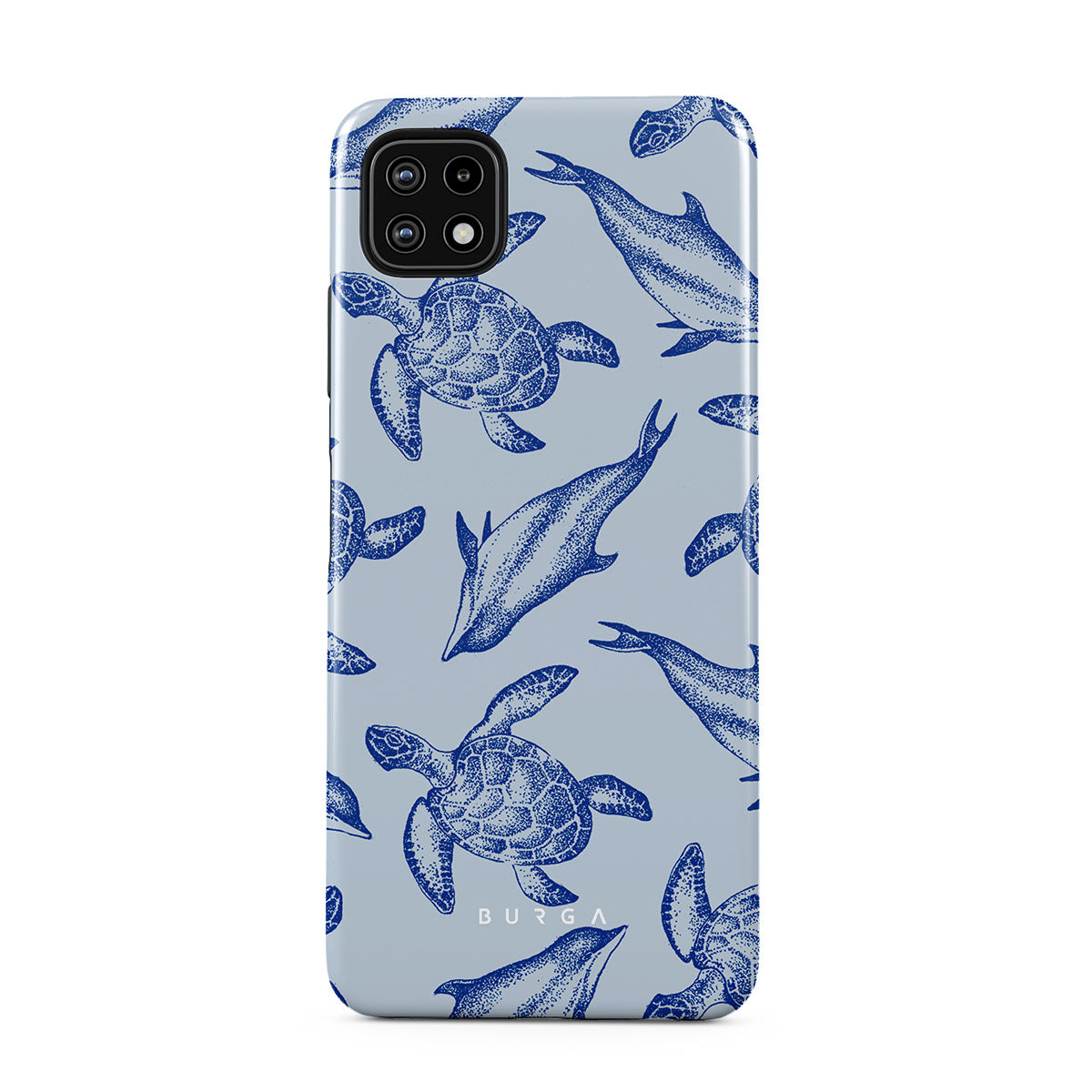 A beautiful design featuring lively turtles and dolphins playfully dancing in serene light blue water. Dive into the ocean's rhythm with our Aquatic Dance Samsung Galaxy A22 5G case.
