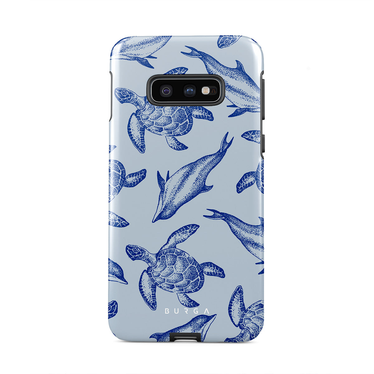 A beautiful design featuring lively turtles and dolphins playfully dancing in serene light blue water. Dive into the ocean's rhythm with our Aquatic Dance Samsung Galaxy S10E case.