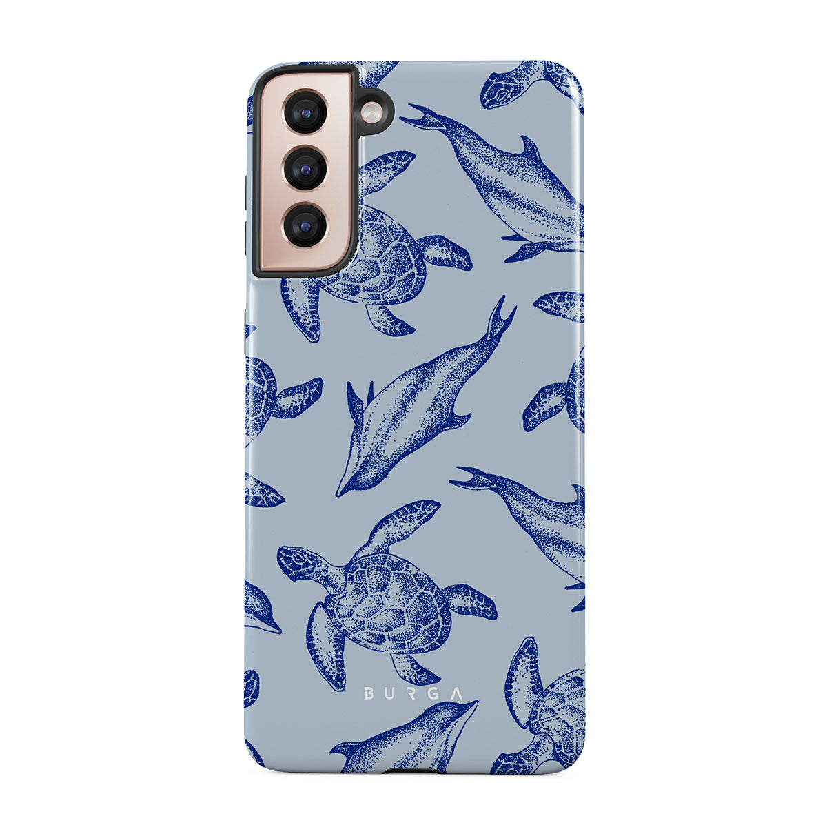 A beautiful design featuring lively turtles and dolphins playfully dancing in serene light blue water. Dive into the ocean's rhythm with our Aquatic Dance Samsung Galaxy S21 Plus case.