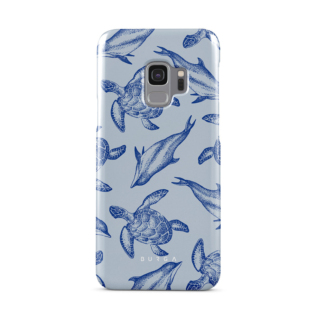 A beautiful design featuring lively turtles and dolphins playfully dancing in serene light blue water. Dive into the ocean's rhythm with our Aquatic Dance Samsung Galaxy S9 case.