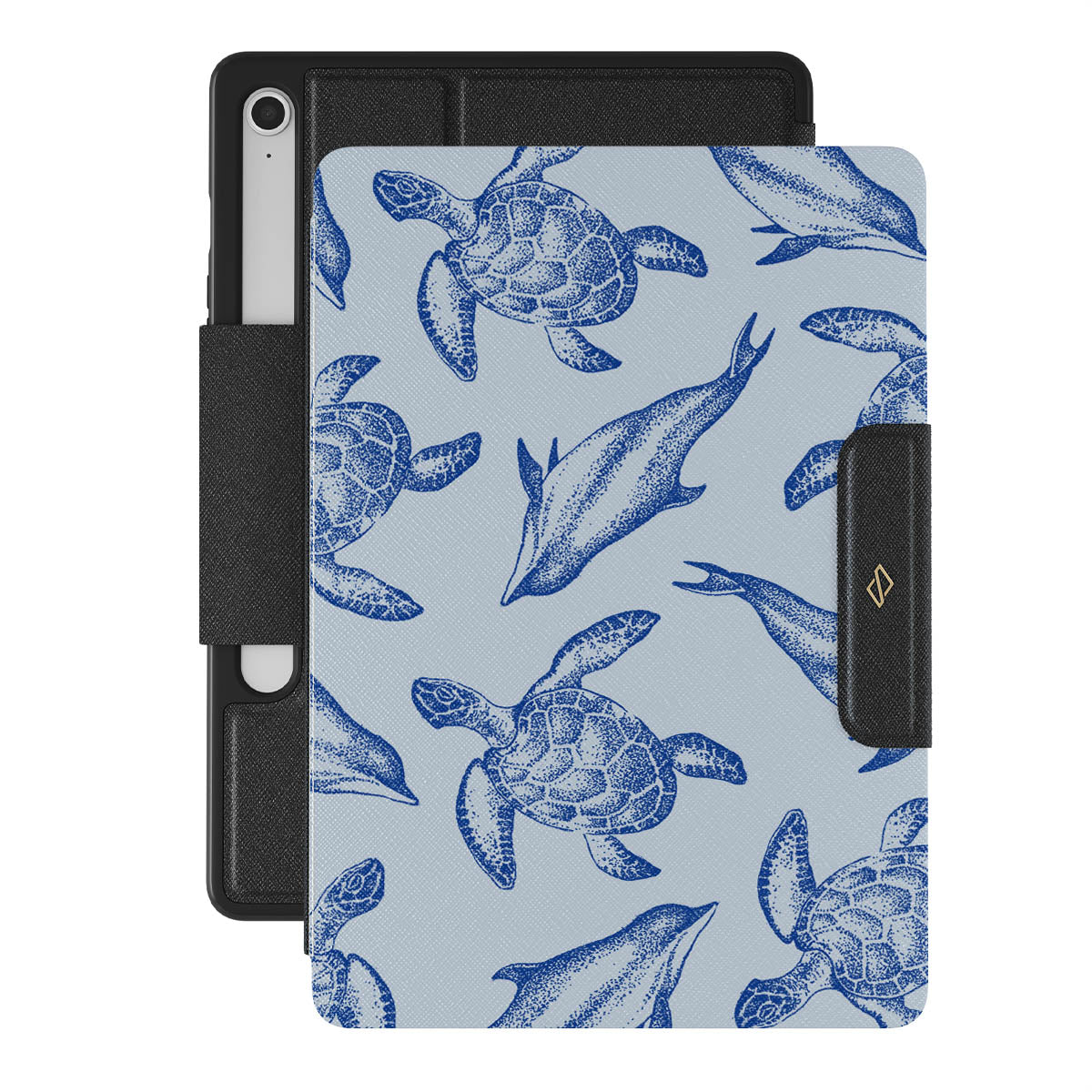 A beautiful design featuring lively turtles and dolphins playfully dancing in serene light blue water. Dive into the ocean's rhythm with our Aquatic Dance Samsung Galaxy Tab S10 FE folio case.