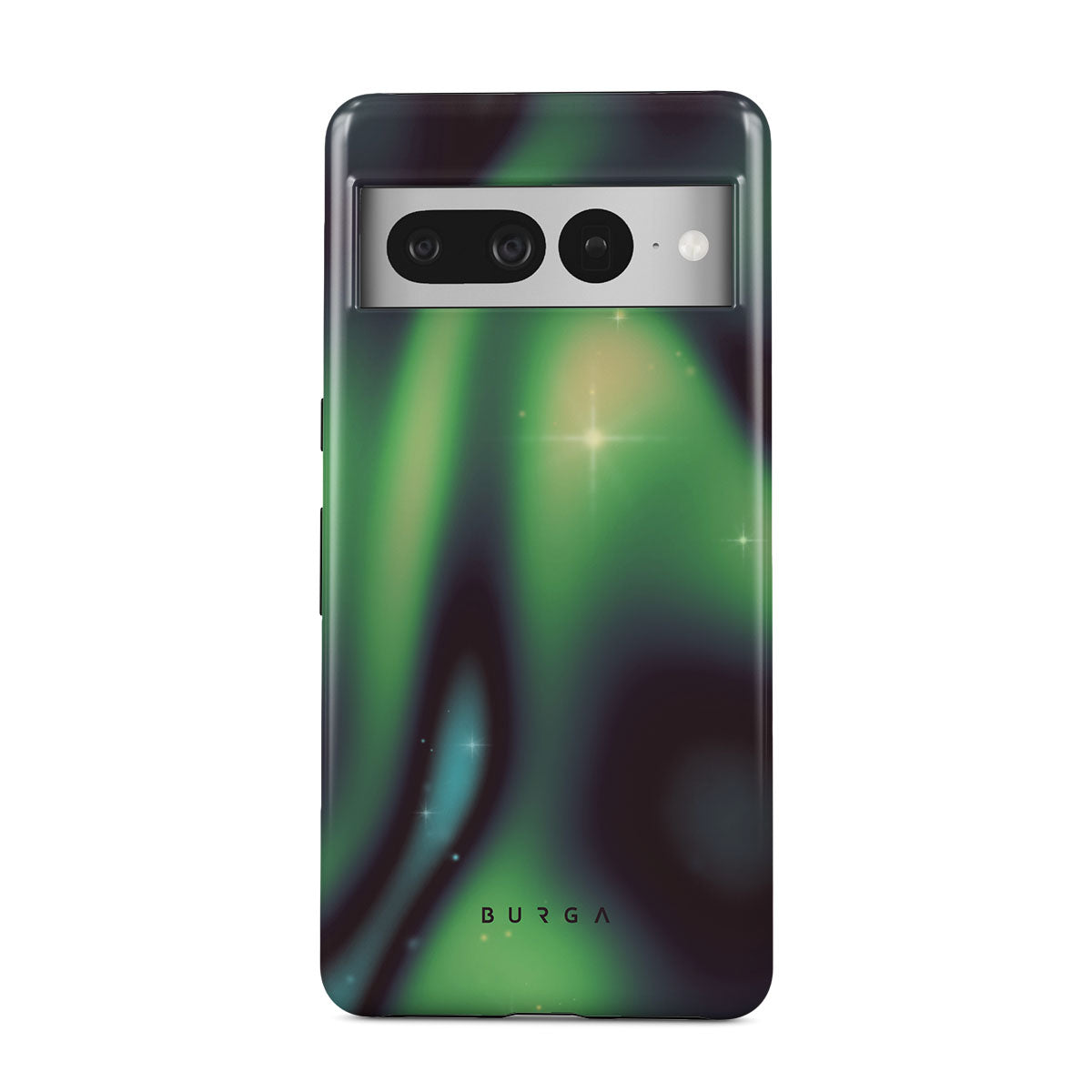 Nature's magic shines through in a mysterious display of lights. Delicate colors intertwine in a ballet of beauty and grace. Poetic harmony is captured with each swirl. It feels as if you're holding a piece of the night sky. Experience the serene grandeur of the Aurora Google Pixel 7 Pro phone case design.