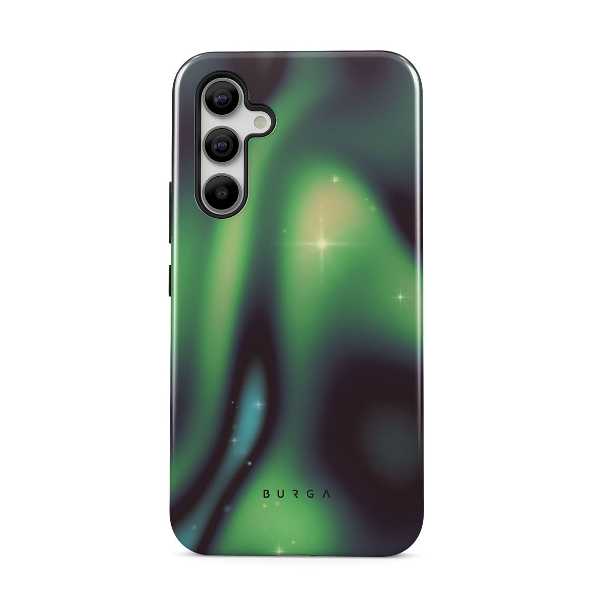 Nature's magic shines through in a mysterious display of lights. Delicate colors intertwine in a ballet of beauty and grace. Poetic harmony is captured with each swirl. It feels as if you're holding a piece of the night sky. Experience the serene grandeur of the Aurora Samsung Galaxy A55 phone case design.