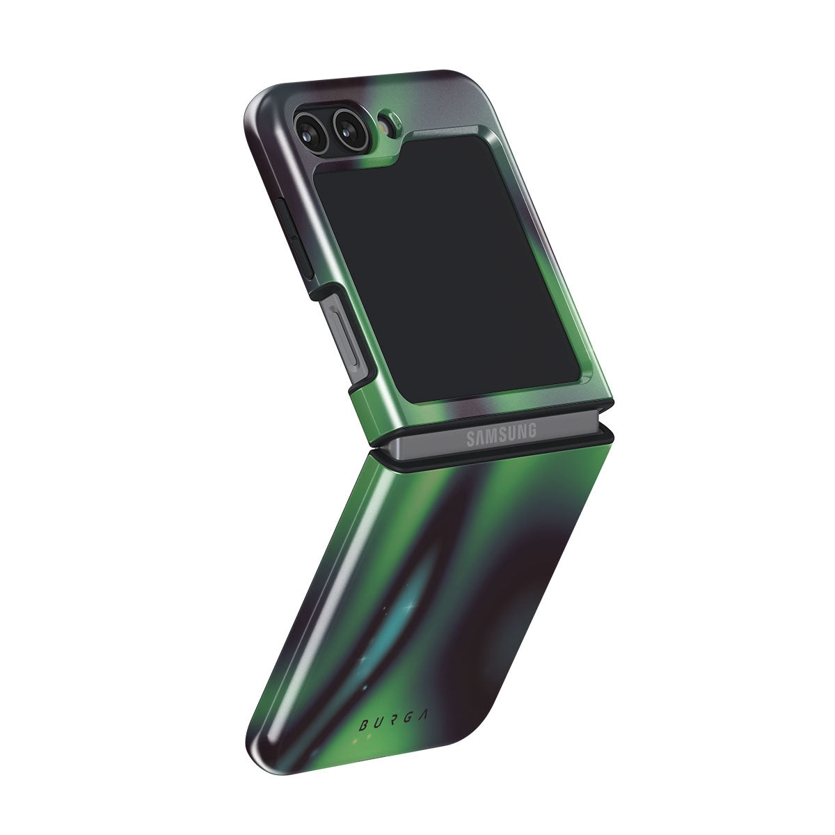 Nature's magic shines through in a mysterious display of lights. Delicate colors intertwine in a ballet of beauty and grace. Poetic harmony is captured with each swirl. It feels as if you're holding a piece of the night sky. Experience the serene grandeur of the Aurora Samsung Galaxy Z Flip 5 phone case design.