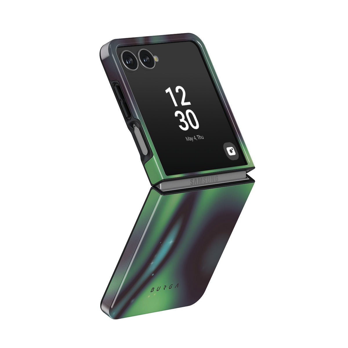 Nature's magic shines through in a mysterious display of lights. Delicate colors intertwine in a ballet of beauty and grace. Poetic harmony is captured with each swirl. It feels as if you're holding a piece of the night sky. Experience the serene grandeur of the Aurora Samsung Galaxy Z Flip 7 phone case design.