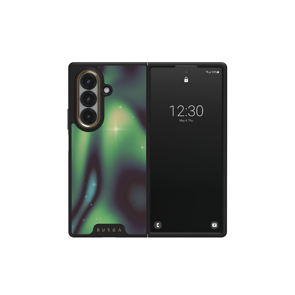 Nature's magic shines through in a mysterious display of lights. Delicate colors intertwine in a ballet of beauty and grace. Poetic harmony is captured with each swirl. It feels as if you're holding a piece of the night sky. Experience the serene grandeur of the Aurora Samsung Galaxy Z Fold 7 phone case design.