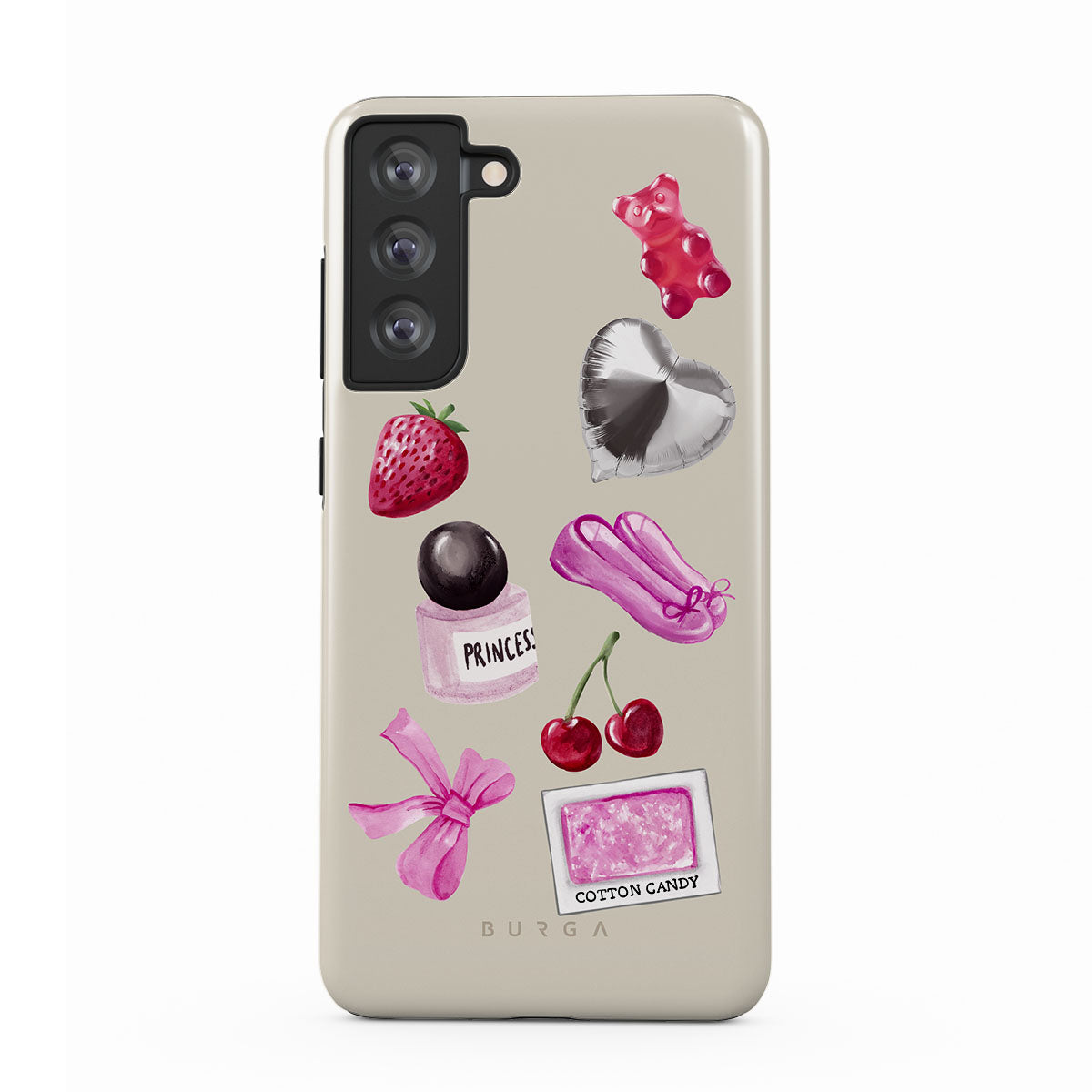 This design features: pink bow, heart-shaped silver balloon, perfume bottle, strawberry, cherries, pink ballet slippers, cotton candy sticker, pink gummy bear