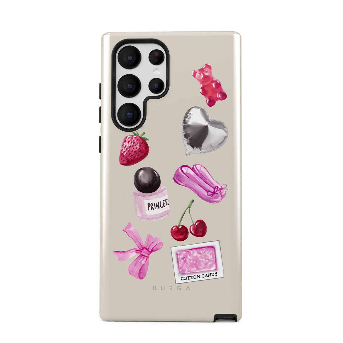 This design features: pink bow, heart-shaped silver balloon, perfume bottle, strawberry, cherries, pink ballet slippers, cotton candy sticker, pink gummy bear