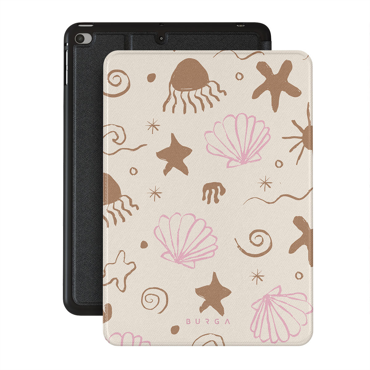 Our Beach Games iPad Mini 7.9 (5th Gen) folio case features a delightful design inspired by seaside treasures, including cute starfish, pink seashells, and playful wave patterns on a sandy background. This beach-themed pattern captures the essence of a fun day at the shore, evoking the joy of discovering beautiful ocean gems.