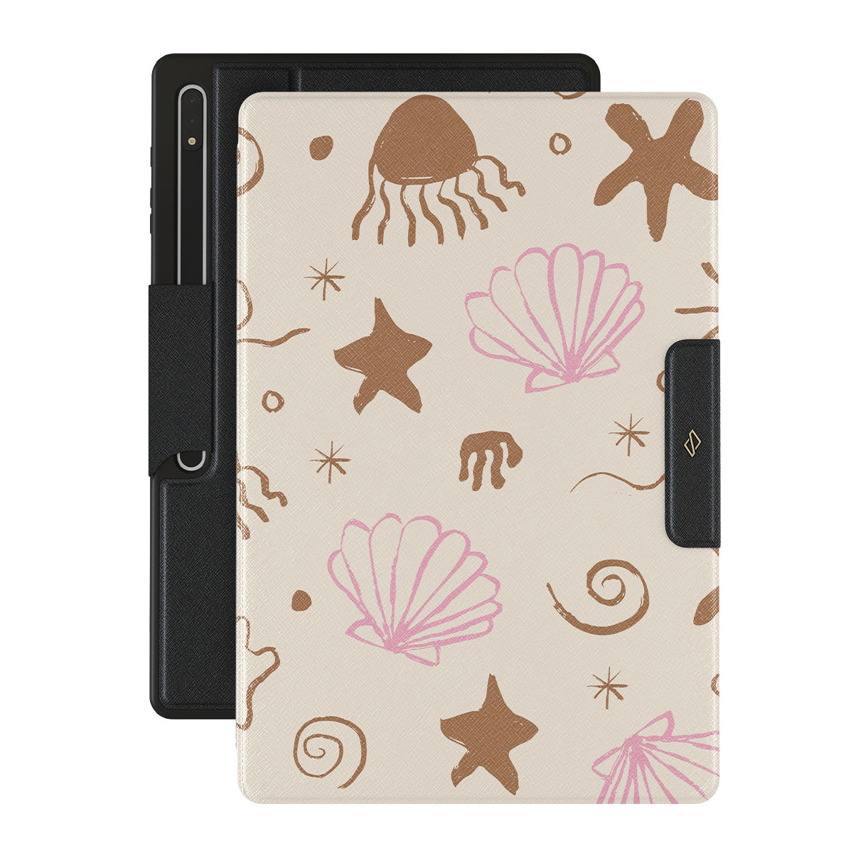 Our Beach Games Samsung Galaxy Tab S10 Ultra folio case features a delightful design inspired by seaside treasures, including cute starfish, pink seashells, and playful wave patterns on a sandy background. This beach-themed pattern captures the essence of a fun day at the shore, evoking the joy of discovering beautiful ocean gems.