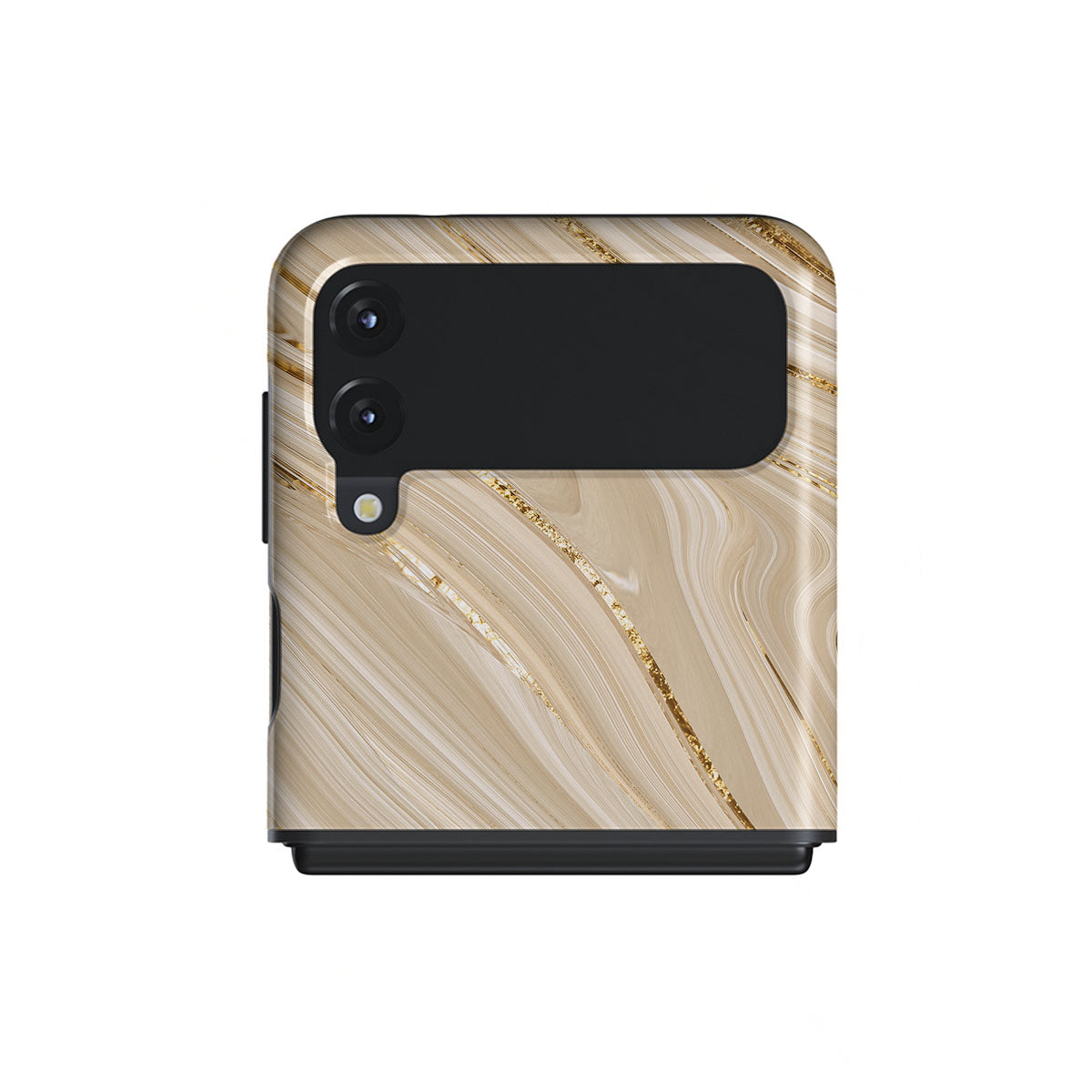 The Full Glam Samsung Galaxy Z Flip 3 phone case exudes elegance and softness in the beige color scheme with golden accents. The delicate design of the phone case will enhance your style and keep your phone safe and sound while doing that.