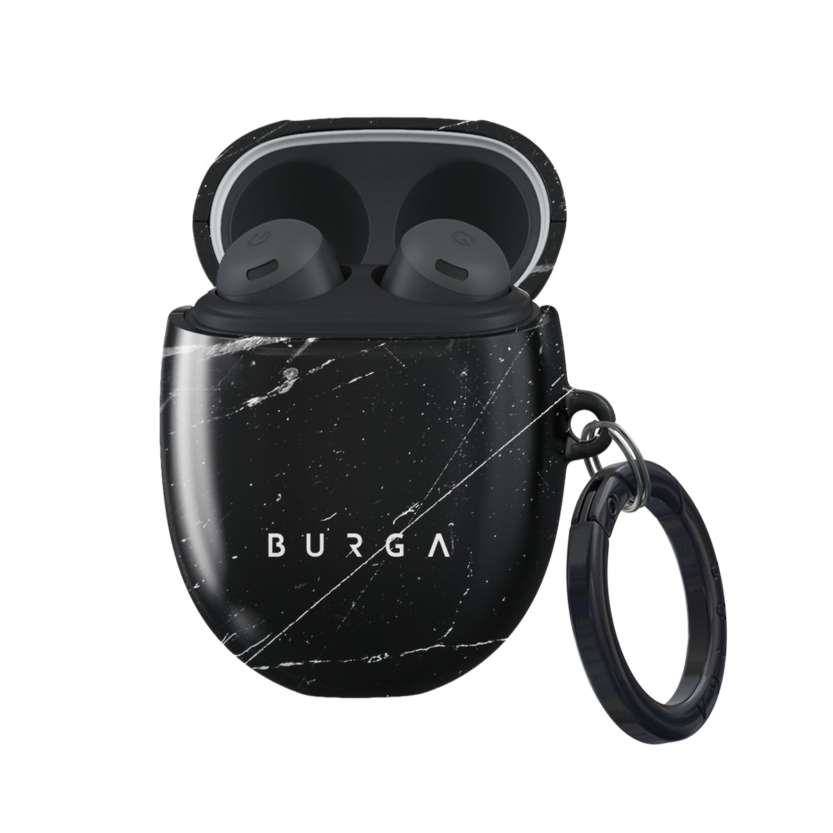 Classical, simple, and minimalistic, our Noir Origin black marble Google Pixel Buds Pro case cover is a must-have. The design that will fit every outfit, catch everyone's eye by looking stunning, and will protect y Our case from scratches and dents? Yes, please! Our case fits perfectly snug around Google Pixel Buds Pro . “Like a glove!” one might say. And it won’t disrupt the wireless charging capabilities of the newer model. There’s even an LED light indicator to prove it (don’t worry, wired charging still works, too). When fitted, the BURGA case will protect the delicate Google Pixel Buds Pro case beneath it from scratches, bumps, and drops while remaining scratch-free itself. Our signature design pattern prints are High Quality, and will never peel or fade away- thanks to our unique printing technology. And finally, a handy carabiner is there to make your life easier and more convenient: just snap it around your keys or belt loop and tackle the day head-on. Your music is right there by your side when you need it.