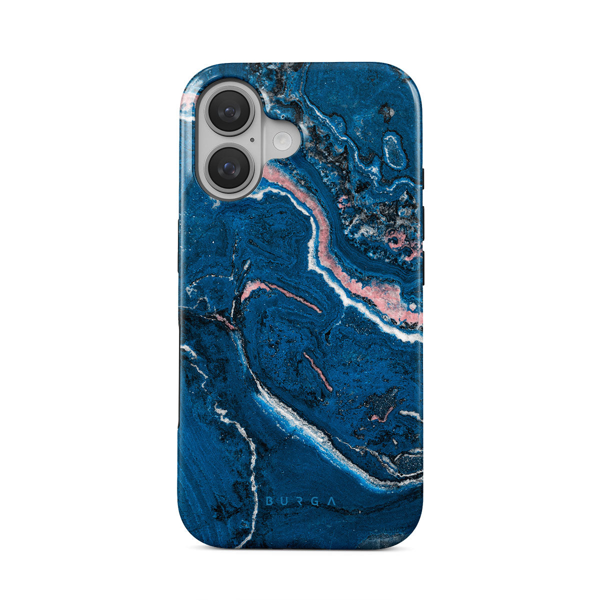 Electric indigo blue meets white, and pastel pink swirls in a unique marble pattern in our Blue Lagoon iPhone 16 phone case. The modern take on a blue marble trend will look aesthetically pleasing on your device while offering durable protection from any falls.