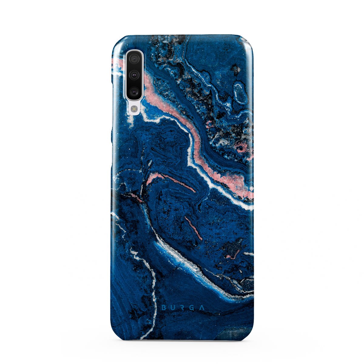 Electric indigo blue meets white, and pastel pink swirls in a unique marble pattern in our Blue Lagoon Samsung Galaxy A70 phone case. The modern take on a blue marble trend will look aesthetically pleasing on your device while offering durable protection from any falls.