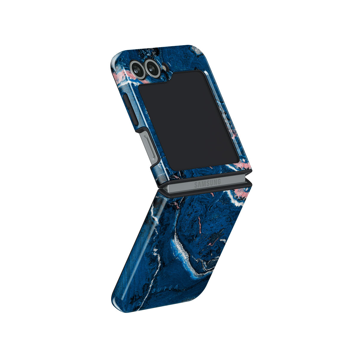 Electric indigo blue meets white, and pastel pink swirls in a unique marble pattern in our Blue Lagoon Samsung Galaxy Z Flip 6 phone case. The modern take on a blue marble trend will look aesthetically pleasing on your device while offering durable protection from any falls.