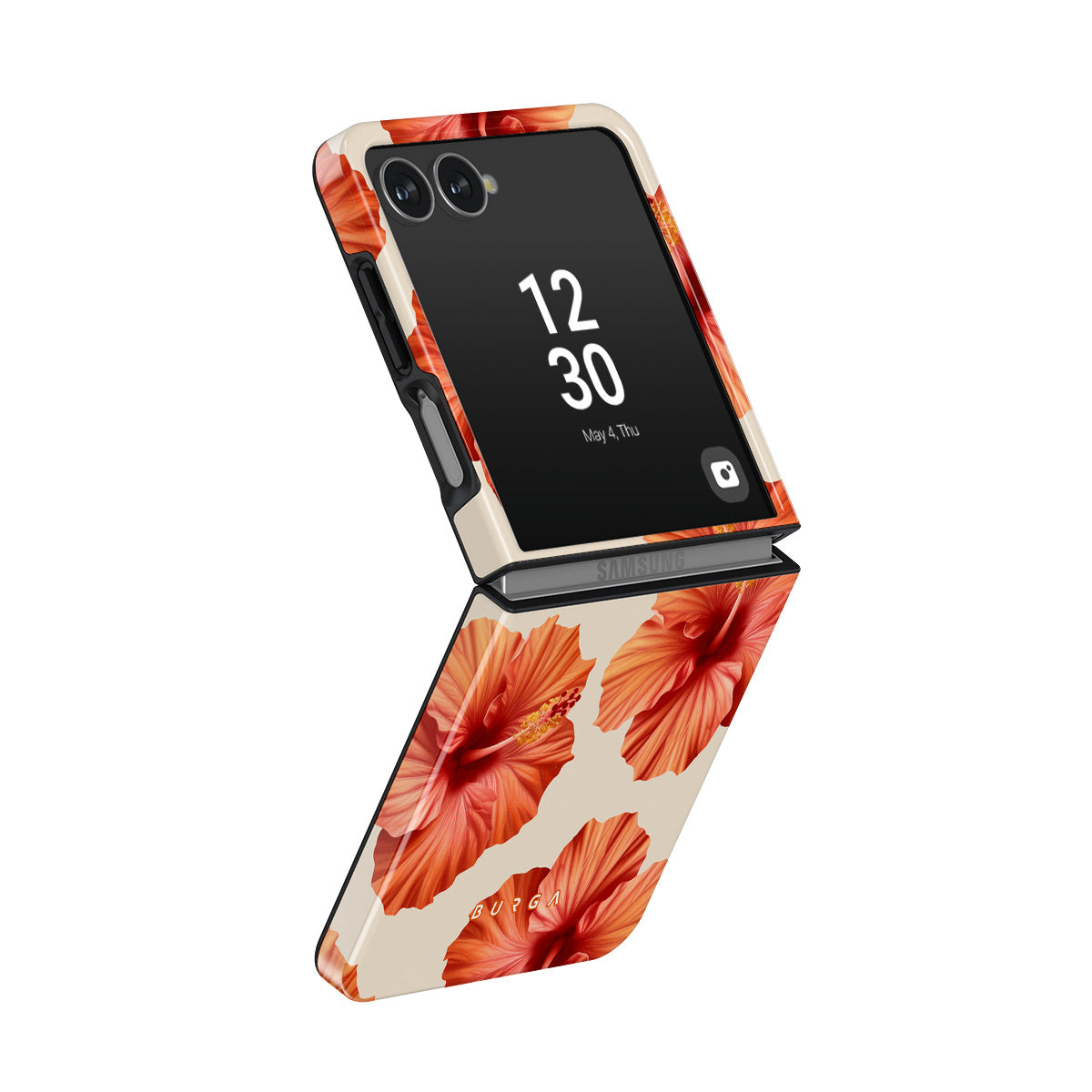 Transport yourself to a lush tropical escape with Bonita. Featuring bold, beautiful hibiscus blooms that pop against a creamy backdrop, this Samsung Galaxy Z Flip 7 phone case design is perfect for those who dream of vibrant, floral beauty and exotic adventures.