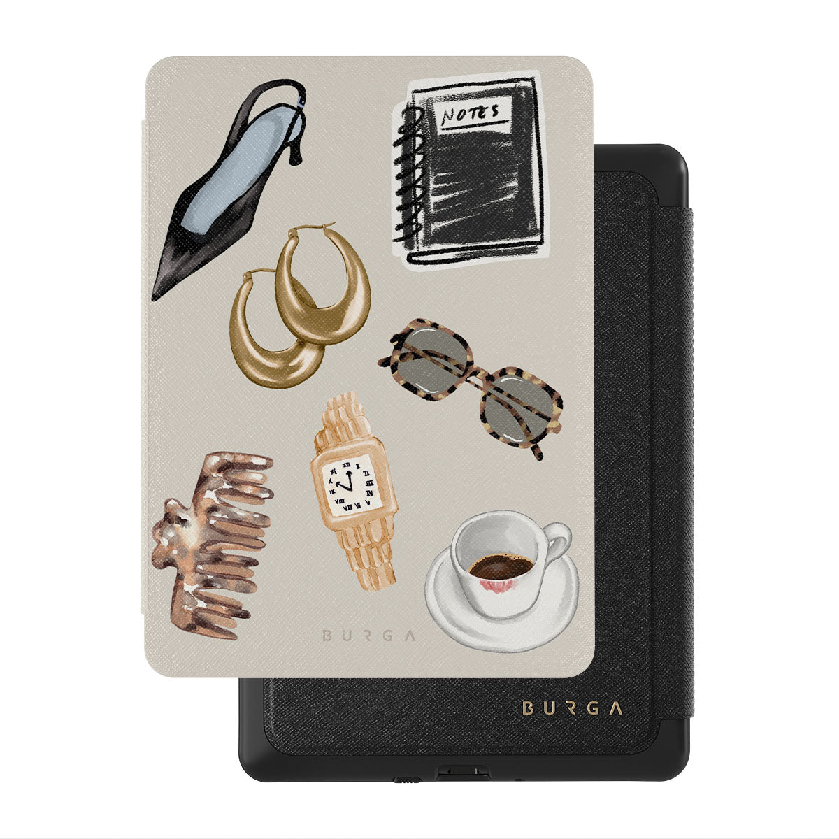 This design features: black high heel, gold hoop earrings, black notebook, coffee cup, tortoiseshell glasses, brown scrunchie, retro gold watch.