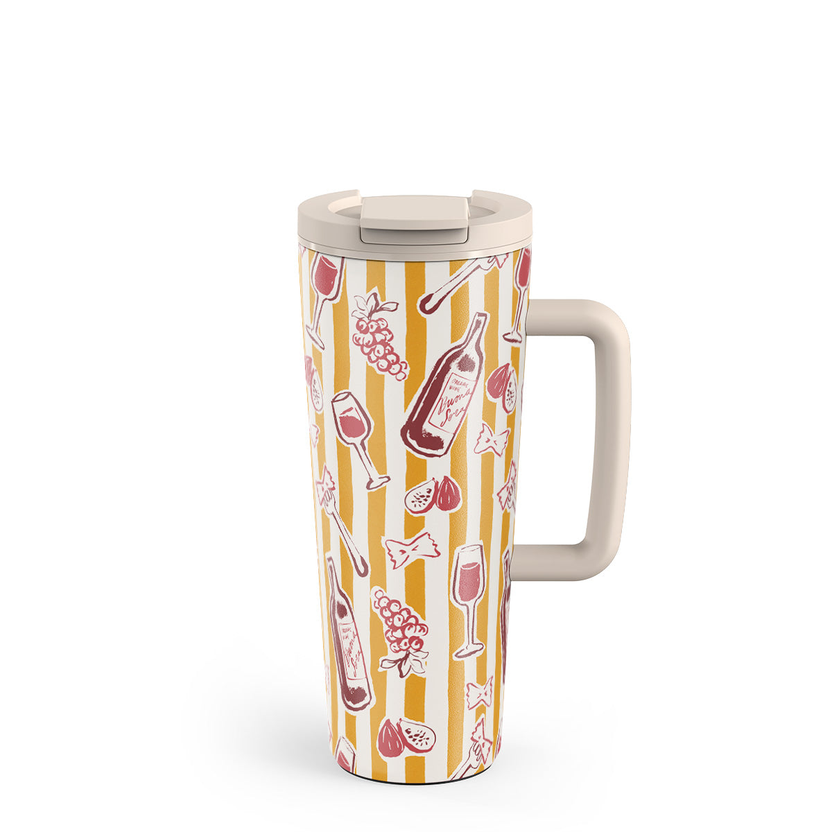 This design features: fruit, figs, grapes, forks, pasta, wine, glass, stripes.