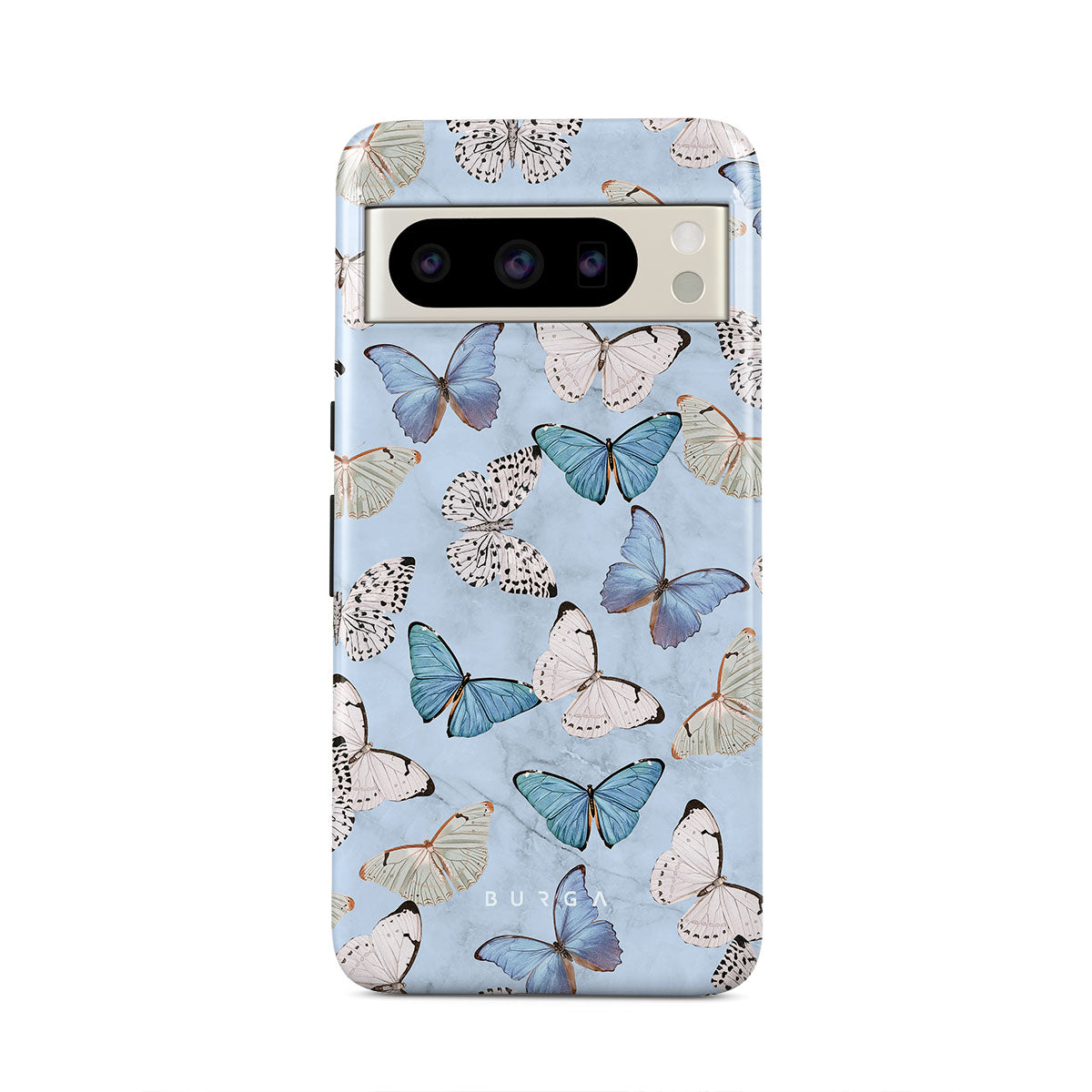Pastel blue and a playful pattern of summery butterflies create a dreamy combination in our Google Pixel 8 Pro phone case. Carry the feeling of the butterflies in your stomach while protecting your phone from any dangers, as the hard-shell case will keep it sound and safe.
