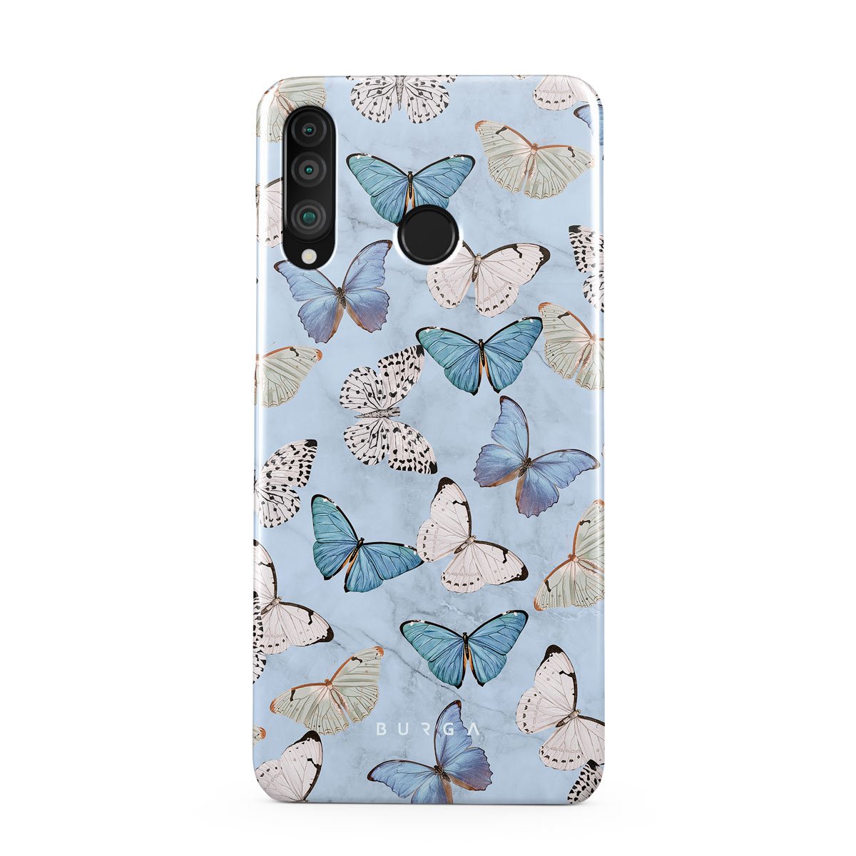 Pastel blue and a playful pattern of summery butterflies create a dreamy combination in our Huawei P30 Lite phone case. Carry the feeling of the butterflies in your stomach while protecting your phone from any dangers, as the hard-shell case will keep it sound and safe.