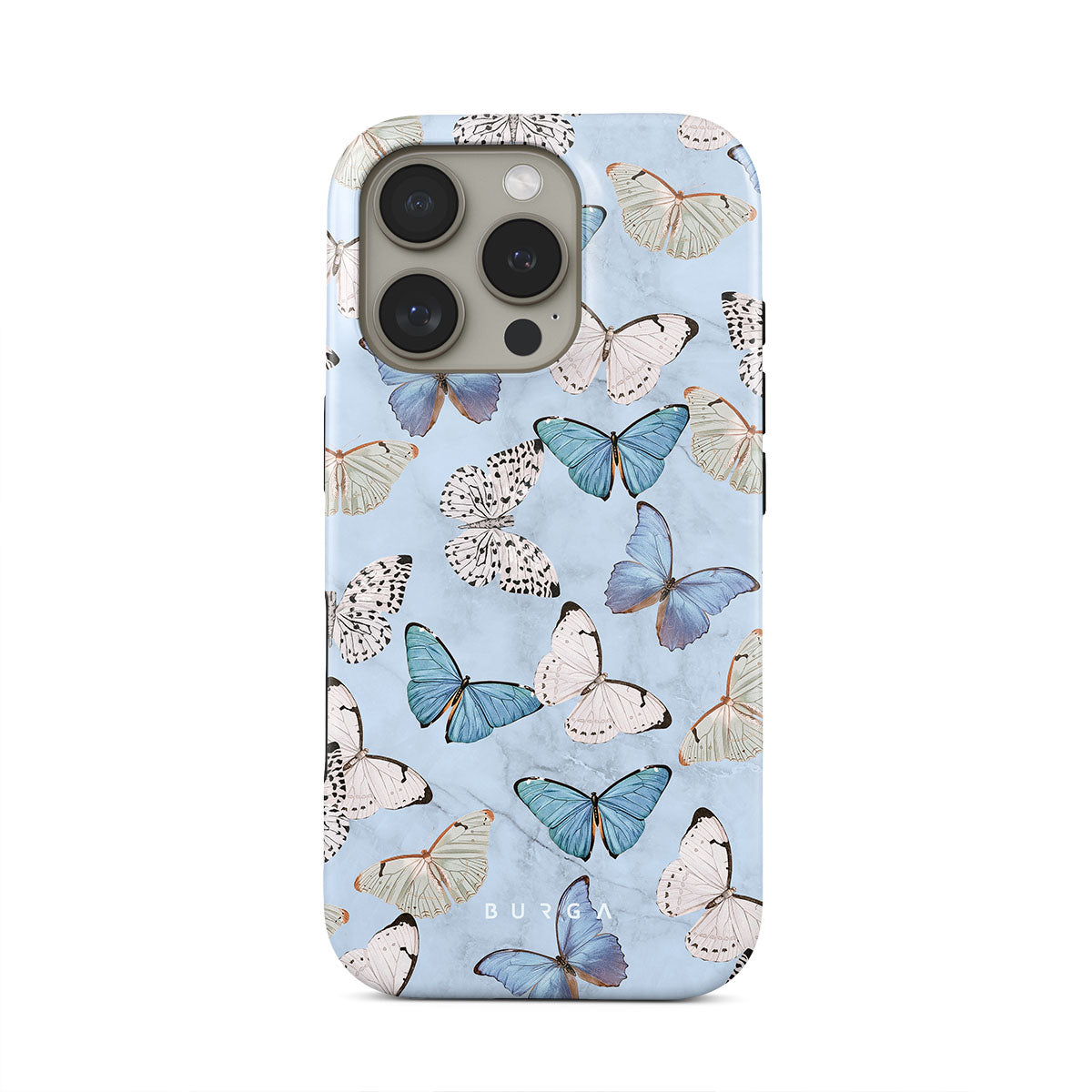 Pastel blue and a playful pattern of summery butterflies create a dreamy combination in our iPhone 16 Pro Max phone case. Carry the feeling of the butterflies in your stomach while protecting your phone from any dangers, as the hard-shell case will keep it sound and safe.