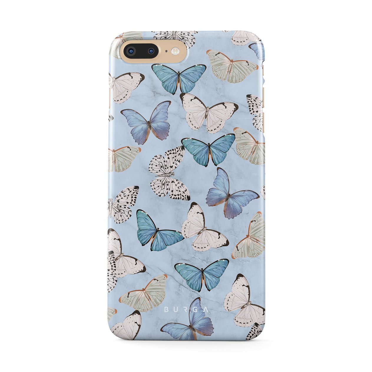 Pastel blue and a playful pattern of summery butterflies create a dreamy combination in our iPhone 7 Plus / 8 Plus phone case. Carry the feeling of the butterflies in your stomach while protecting your phone from any dangers, as the hard-shell case will keep it sound and safe.