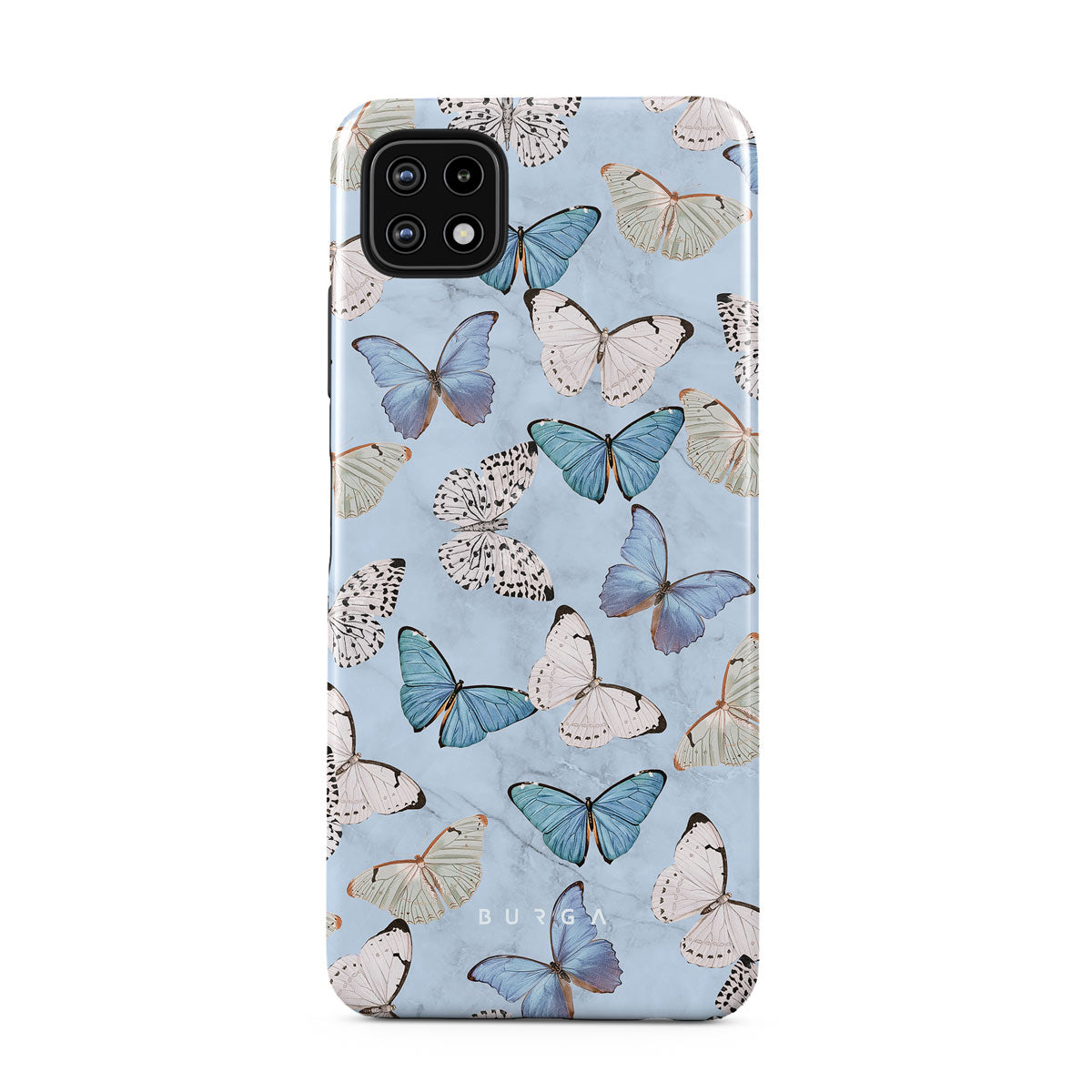 Pastel blue and a playful pattern of summery butterflies create a dreamy combination in our Samsung Galaxy A22 5G phone case. Carry the feeling of the butterflies in your stomach while protecting your phone from any dangers, as the hard-shell case will keep it sound and safe.
