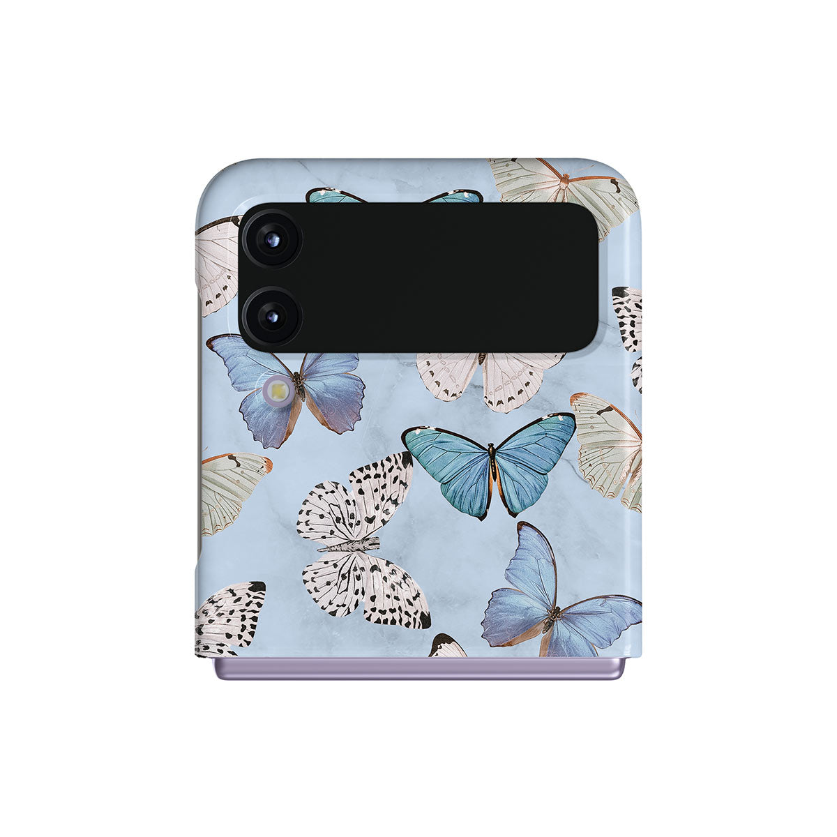 Pastel blue and a playful pattern of summery butterflies create a dreamy combination in our Samsung Galaxy Z Flip 4 phone case. Carry the feeling of the butterflies in your stomach while protecting your phone from any dangers, as the hard-shell case will keep it sound and safe.