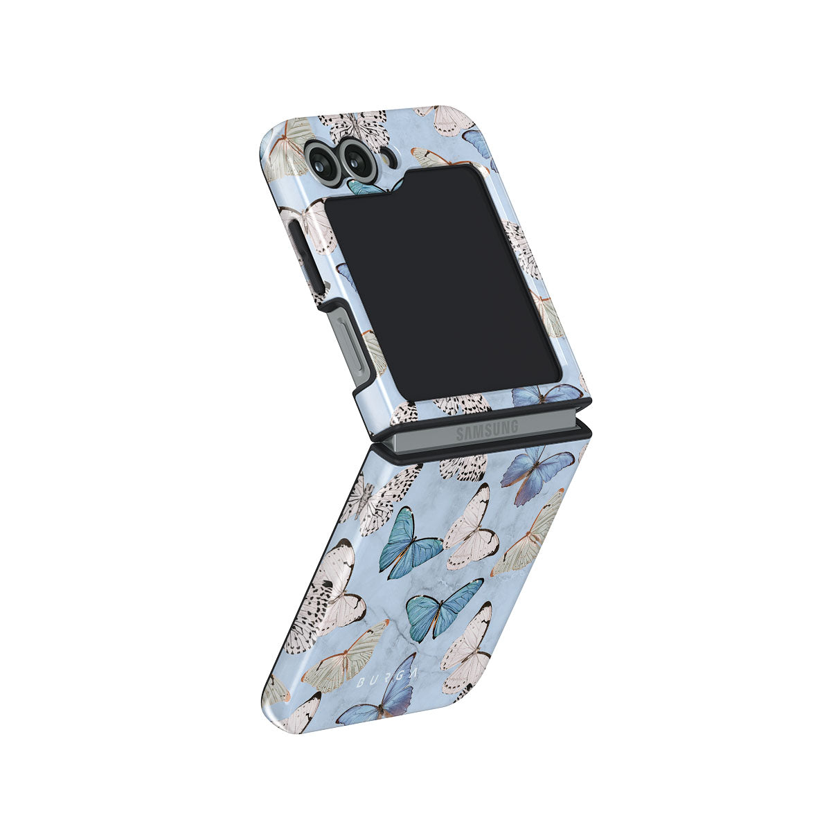 Pastel blue and a playful pattern of summery butterflies create a dreamy combination in our Samsung Galaxy Z Flip 6 phone case. Carry the feeling of the butterflies in your stomach while protecting your phone from any dangers, as the hard-shell case will keep it sound and safe.