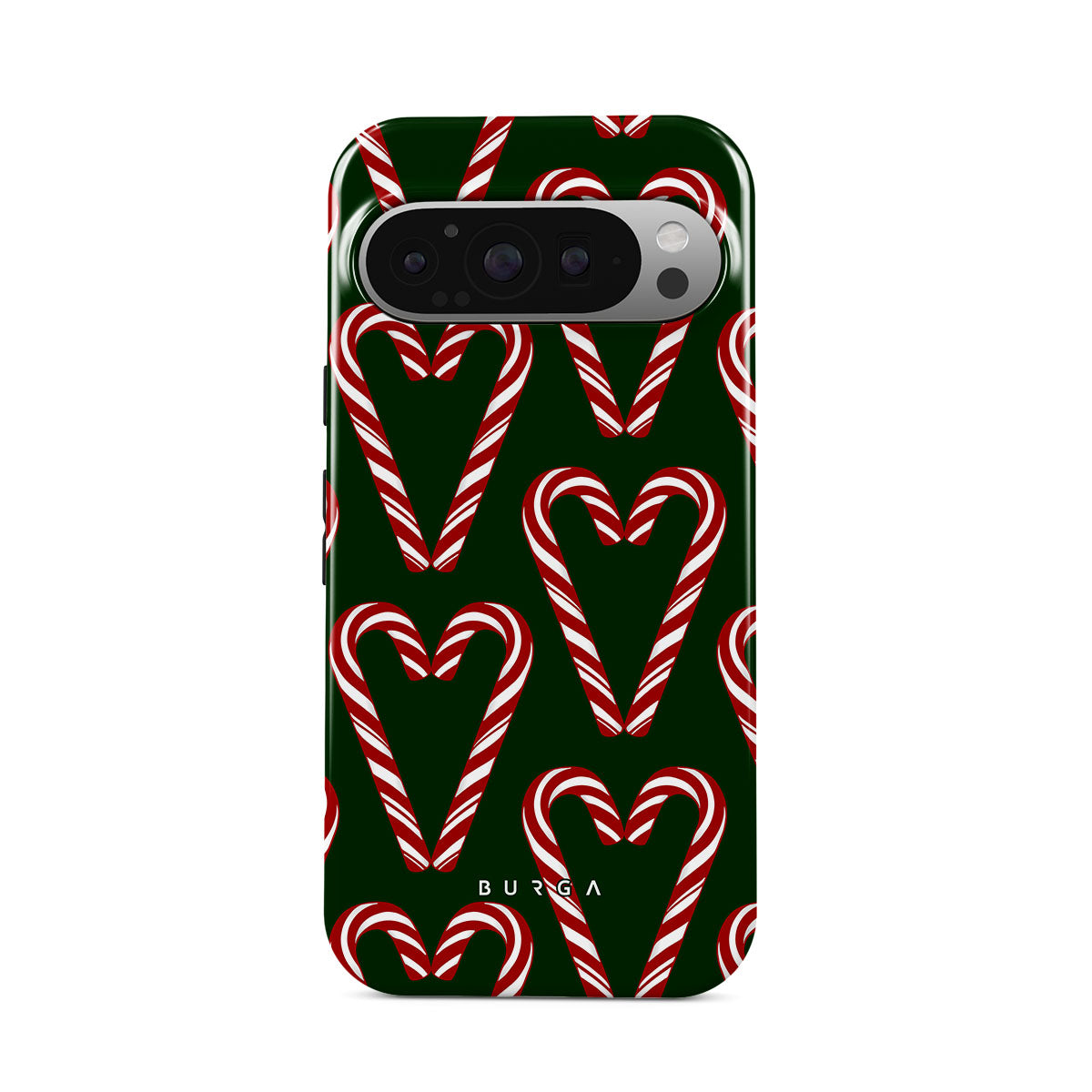 Vibrant and playful, our Candy Cane Google Pixel 9 Pro XL Case phone case design showcases candy cane heart motifs against a dark green background—a delightful choice for those who love a touch of whimsy and nostalgia.