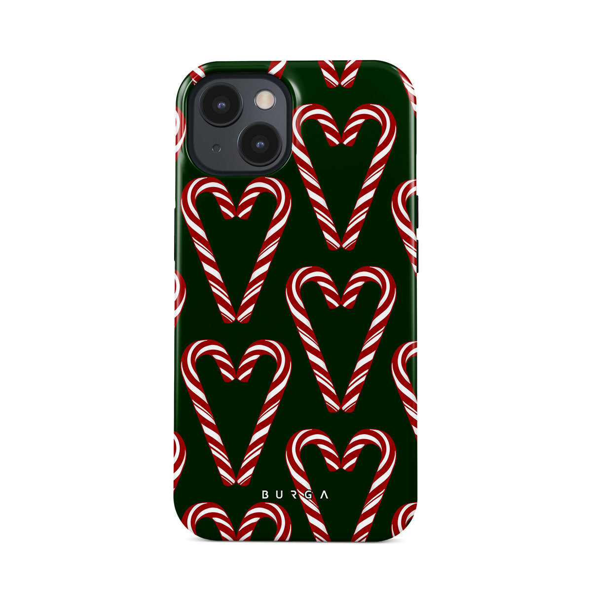 Vibrant and playful, our Candy Cane iPhone 15 Case phone case design showcases candy cane heart motifs against a dark green background—a delightful choice for those who love a touch of whimsy and nostalgia.