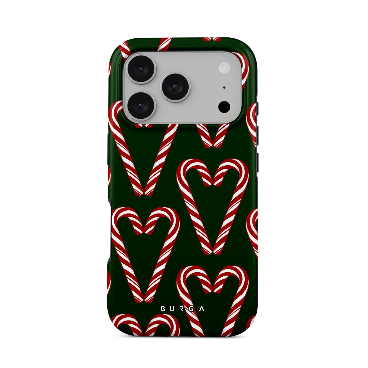 Vibrant and playful, our Candy Cane iPhone 17 Pro Case phone case design showcases candy cane heart motifs against a dark green background—a delightful choice for those who love a touch of whimsy and nostalgia.