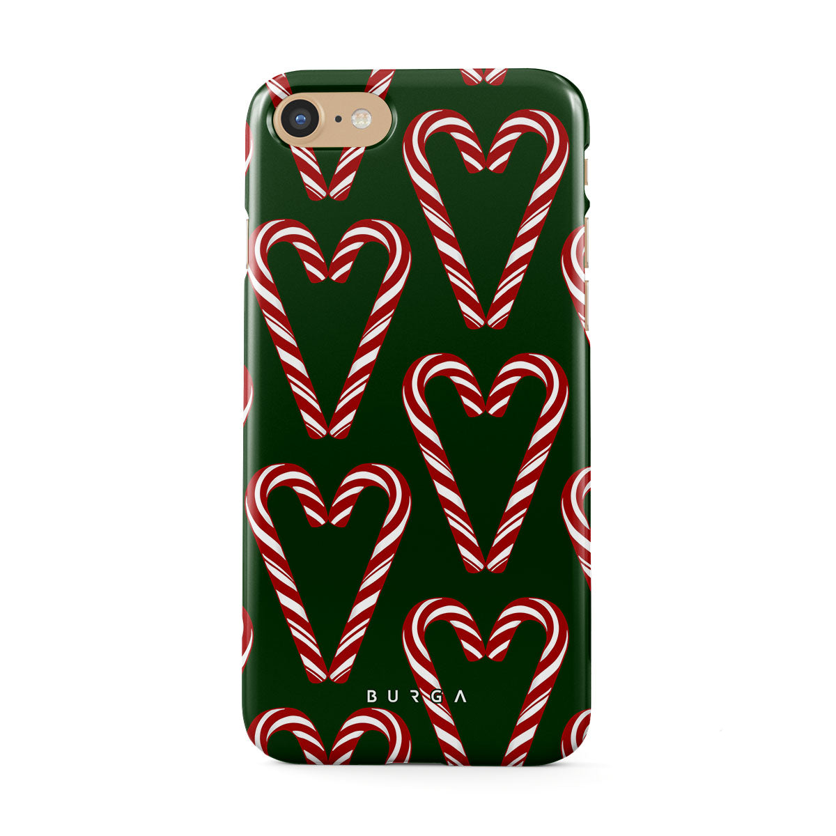 Vibrant and playful, our Candy Cane iPhone SE (2022) Case phone case design showcases candy cane heart motifs against a dark green background—a delightful choice for those who love a touch of whimsy and nostalgia.
